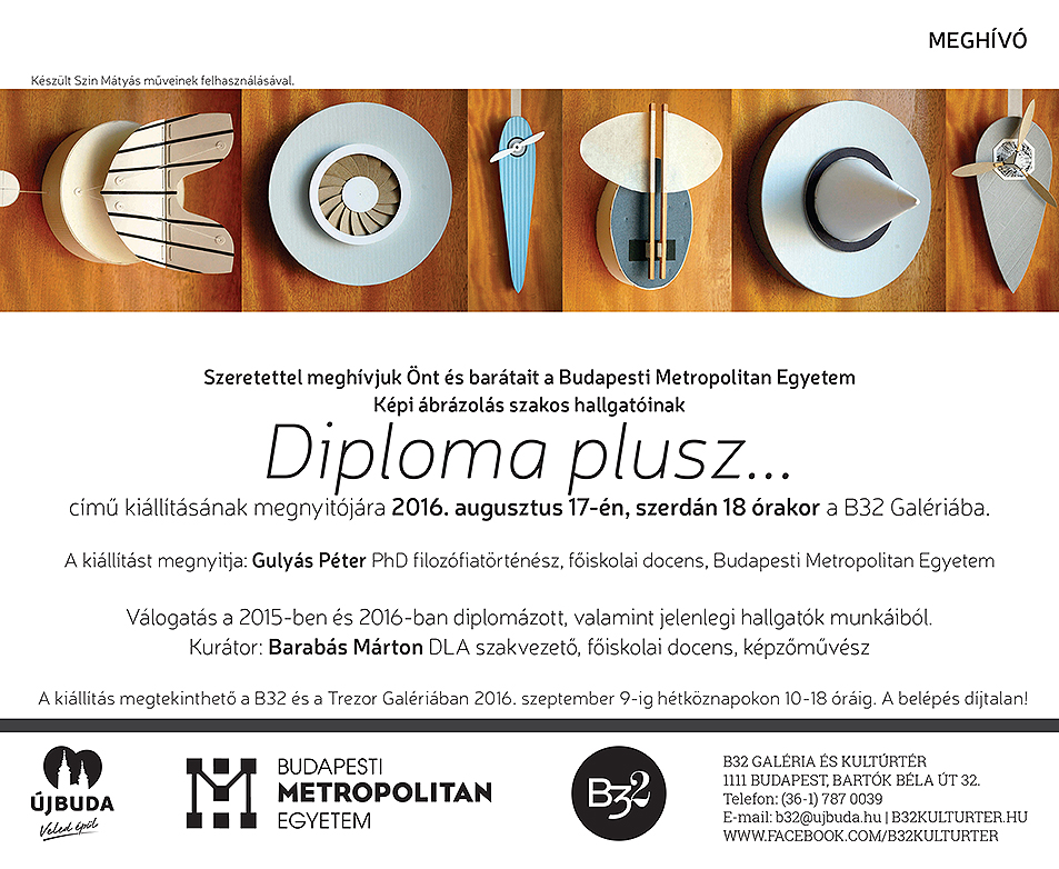 2016. augusztus 17-én, szerdán 18 órakor nyílik a Diploma plusz... c. kiállítás, amely egy válogatás a 2015-ben és 2016-ban diplomázott, valamint a jelenlegi hallgatók munkáiból.