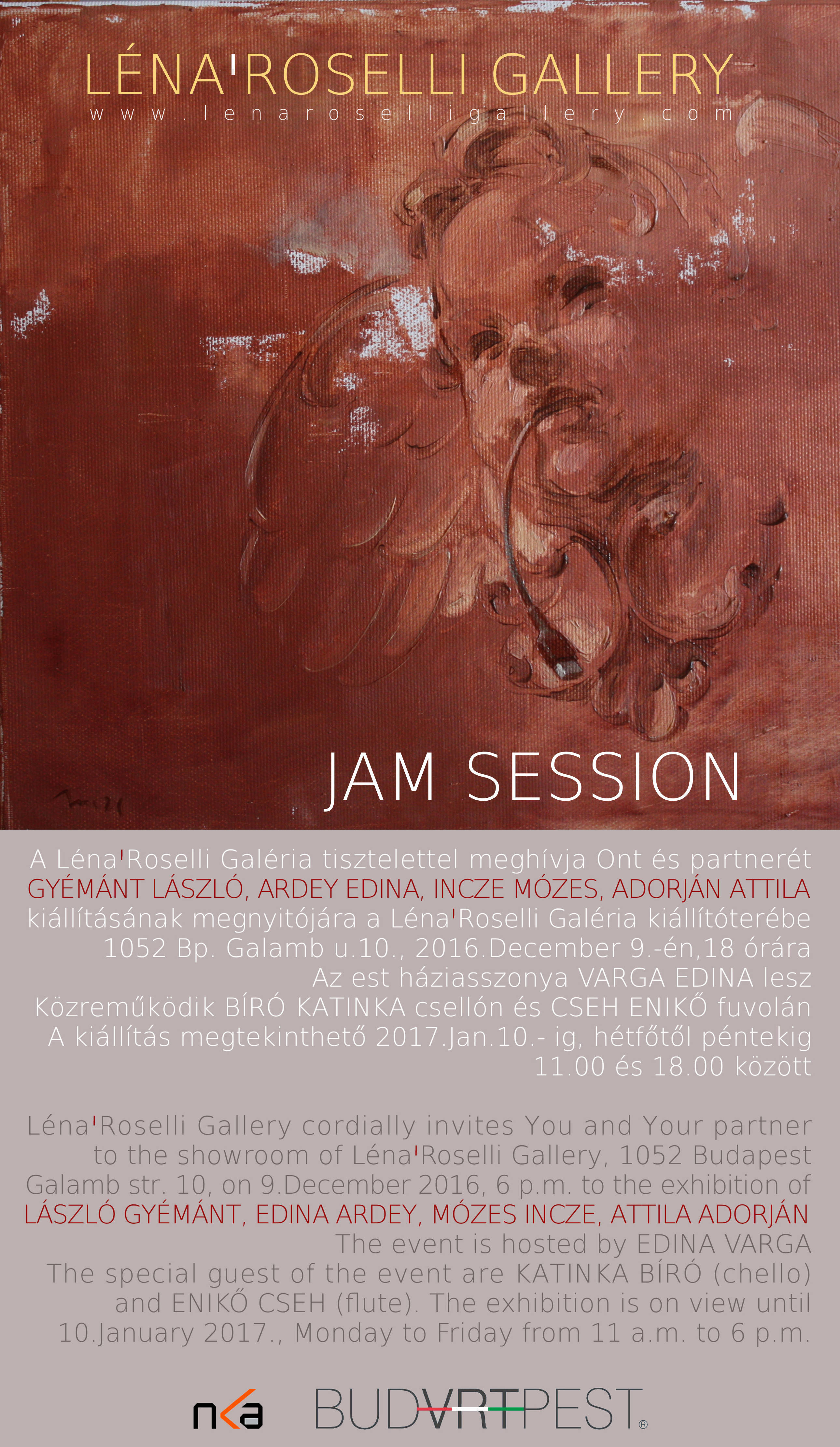 A Jam Session értelem szerinti jelentése ,, öröm zene " . Az eredeti angol kifejezés elsősorban a jazz pódiumán vált ismertté és ment át a közhasználatba . Konkrét értelemben amikor zenészek spontán önfeledten gyakran első találkozásukkor a többi zenésszel önként jelentkeznek be a saját hangszerükkel játékra , s így alakul saját és a közönség örömére az improvizatív közös szórakozás és szórakoztatás öröme. Más művészek , így a festők is gyakran igénylik egymás társaságát ,hogy kiszabaduljanak a műterem, vagy a ,, one man show “ magányából, együtt örüljenek egymás művei láttán és ez talán a közönség számára is külön érdekesség. Mintha egy étterem étlapjáról választhatnák ízlésük szerint amit éppen megkívánnak, szemben a tömegétkeztetés egyhangúságával. Mi itt négyen ha nem is csoportosan kínáljuk a különbözőségeinket együttesen ki-ki a magáét, amit ,, főzött “. Mi most itt együtt zenélünk , ki-ki a maga hangszerével , ezért választottuk címnek , hogy ,, Jam Session “ vagyis örömzene .