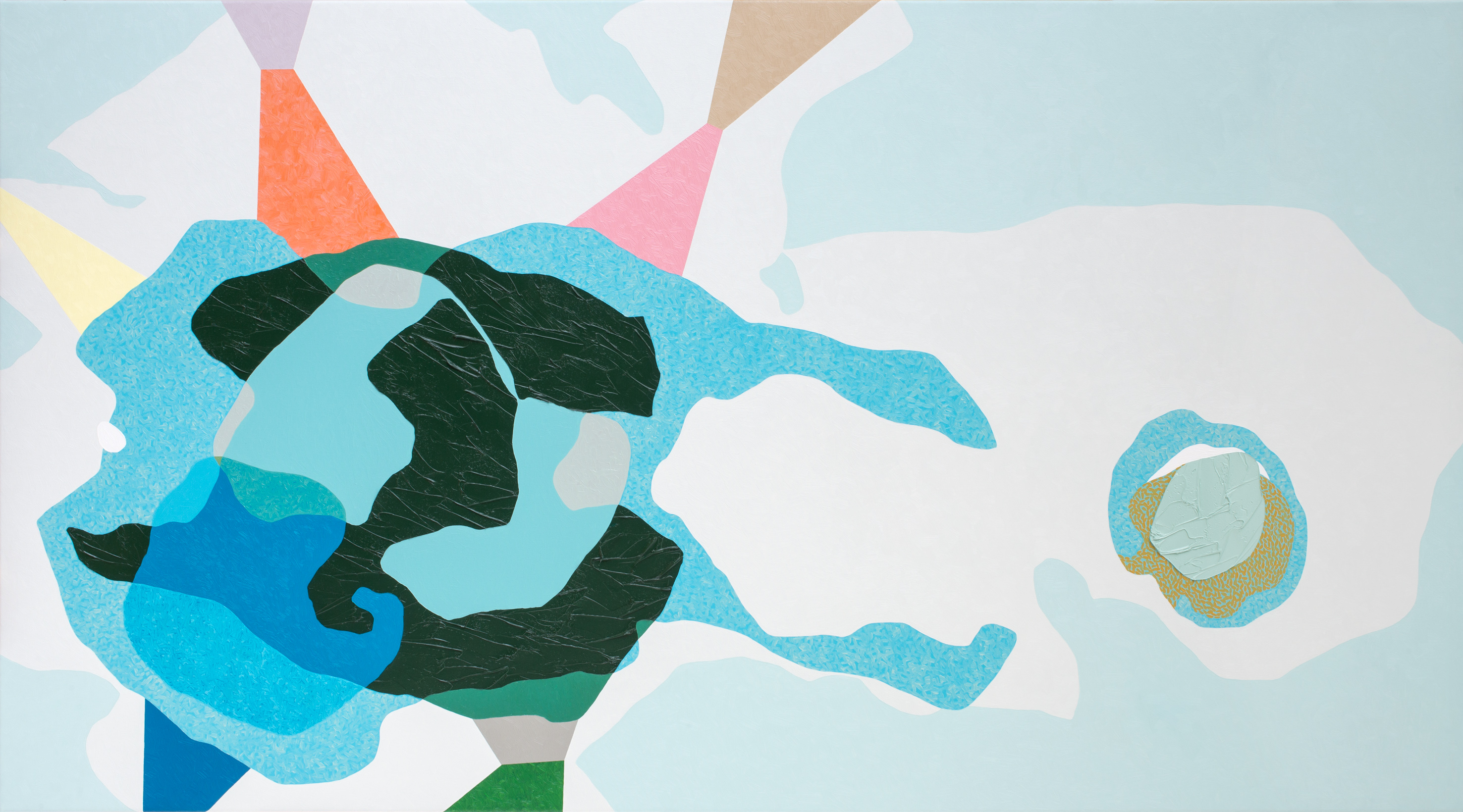 It refers to the frozen moments, when we experience the essence of reality in a flash of an eye. The large-scale oil paintings present personal stories in an abstract form.