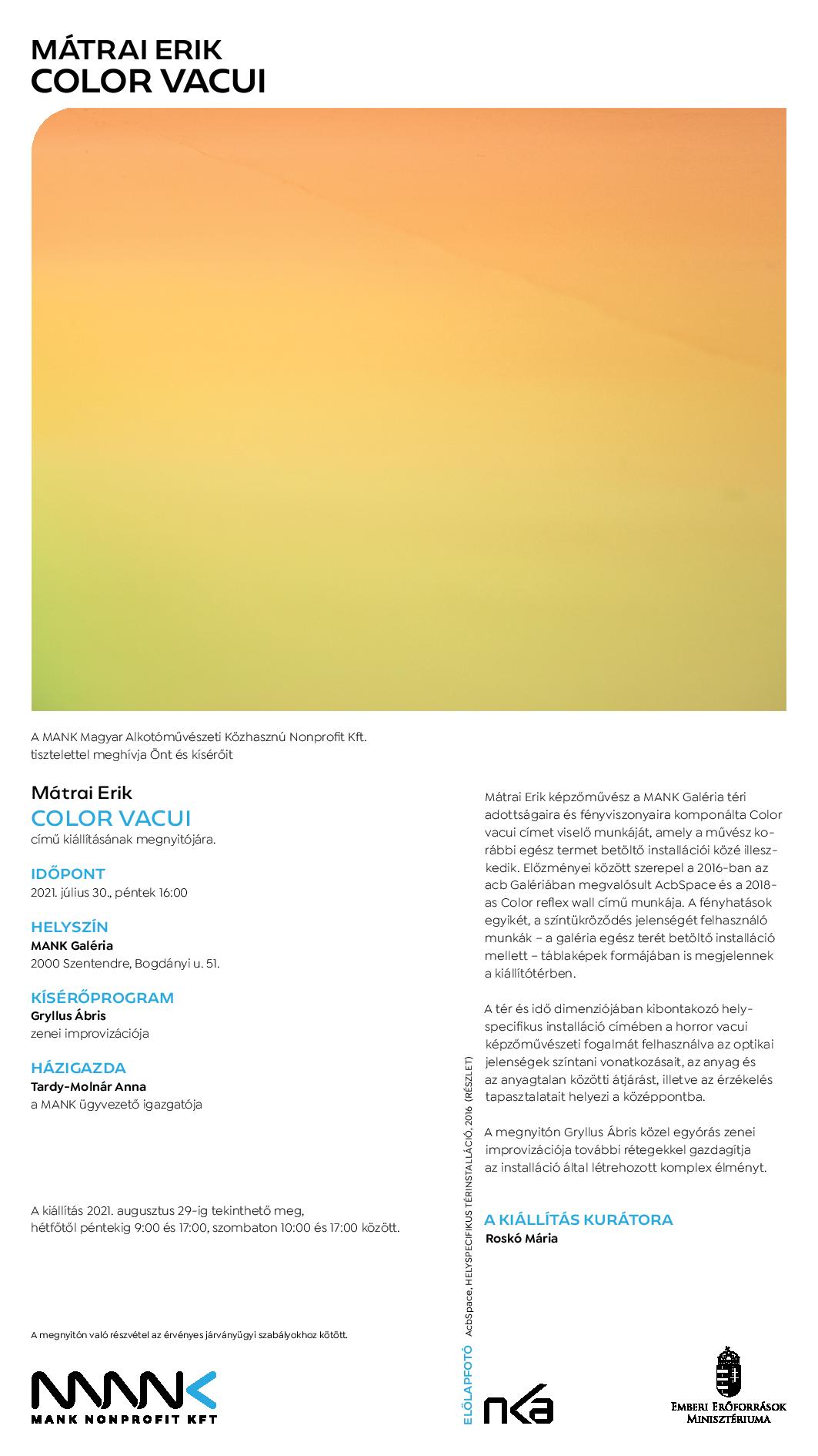 Mátrai Erik képzőművész a MANK Galéria téri adottságaira és fényviszonyaira komponálta Color vacui címet viselő munkáját, amely a művész korábbi egész termet betöltő installációi közé illeszkedik. Előzményei között szerepel a 2016-ban az acb Galériában megvalósult AcbSpace és a 2018-as Color reflex wall című munkája. A fényhatások egyikét, a színtükröződés jelenségét felhasználó munkák – a galéria egész terét betöltő installáció mellett – táblaképek formájában is megjelennek a kiállítótérben.