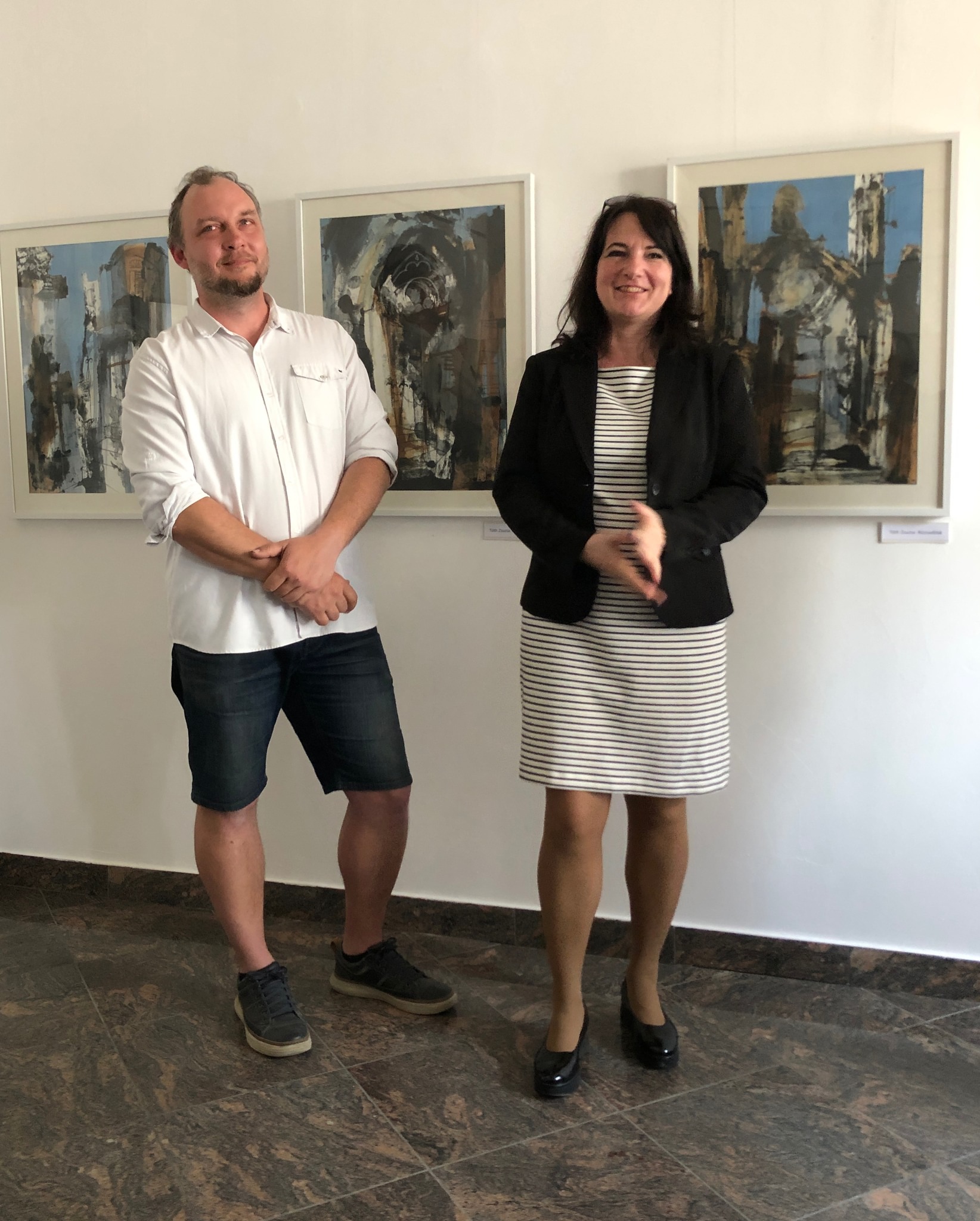 Tóth Zsuzsa és Börcsök Attila beszélget az érdeklődőkkel a kiállítási környezetben arról, hogy milyen anyaggal és technikával dolgoznak, mi inspirálja őket a témaválasztásban.