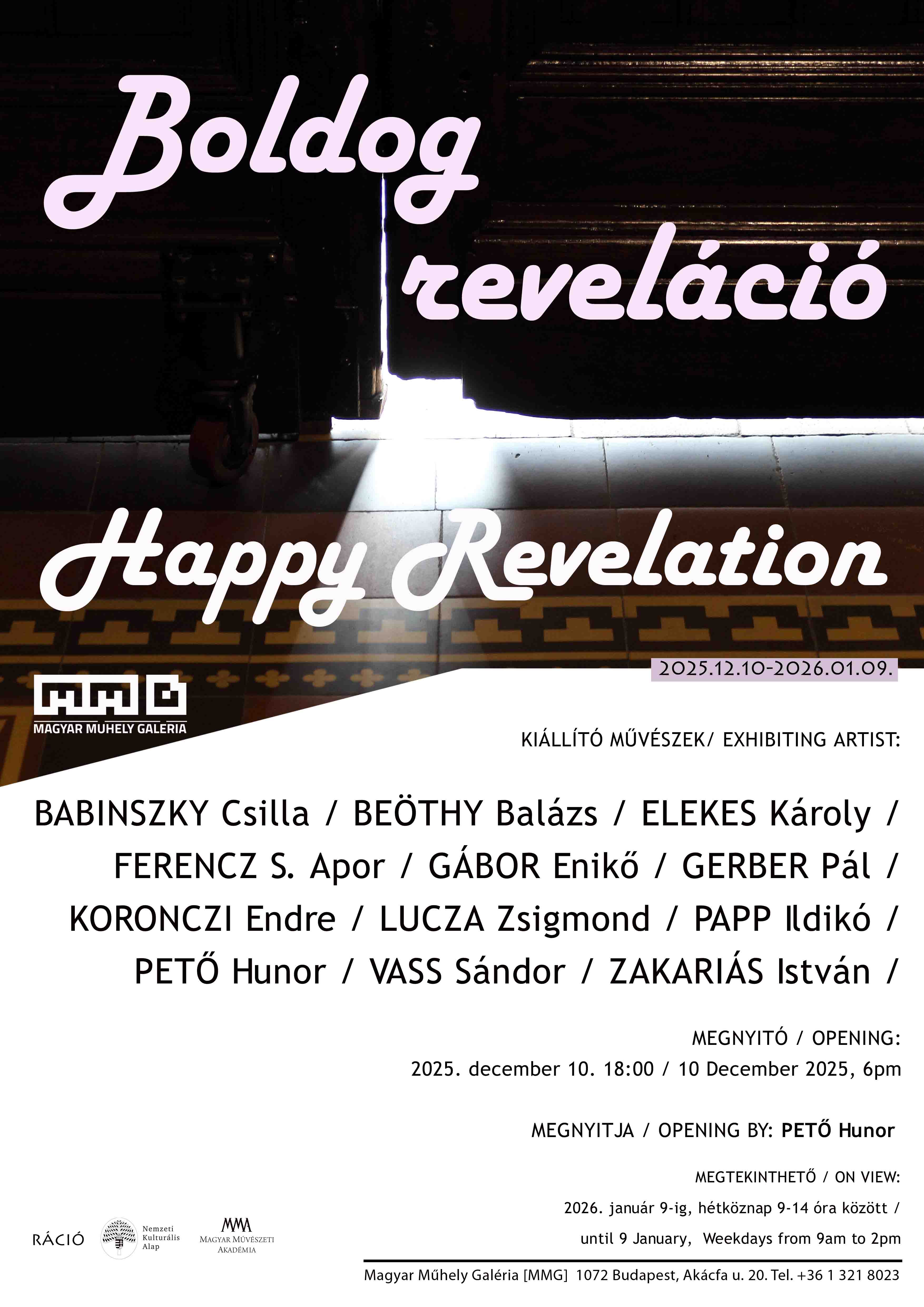 Boldog reveláció / Happy Revelation | BABINSZKY Csilla, BEÖTHY Balázs, ELEKES Károly, FERENCZ S. Apor, GÁBOR Enikő, GERBER Pál, KORONCZI Endre, LUCZA Zsigmond, PAPP Ildikó, PETŐ Hunor, VASS Sándor, ZAKARIÁS István