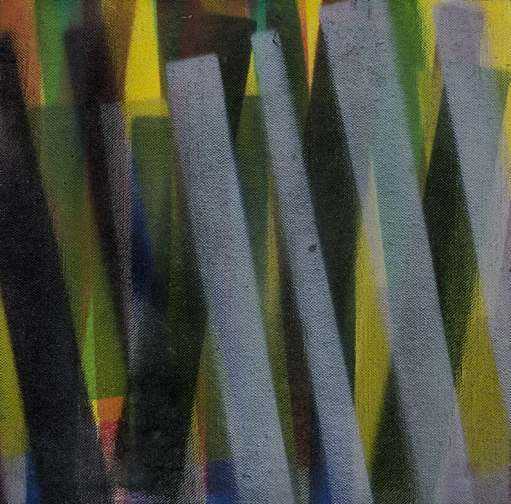 Lazán, közel párhuzamosan futó, rivalizáló, néhol egymást keresztező, egymás alá, vagy fölé keveredő színes vonalsávok — szövedékek — kapcsolódnak egymásba és töltik ki rendezett rendetlenségben a képmezőt.
