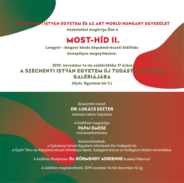 MOST-HÍD 2 címmel Lengyel-magyar képzőművészeti kiállítás nyílik 2019.11.14-én, csütörtökön 17 órakor a Széchenyi István Egyetem Új Tudástér emeleti galériájában - Győr, Egyetem tér 1. - a győri Art World Hungary Egyesület, a Lengyel Művészek és Tervezők Szövetsége és a Széchenyi István Egyetem együttműködésében.
