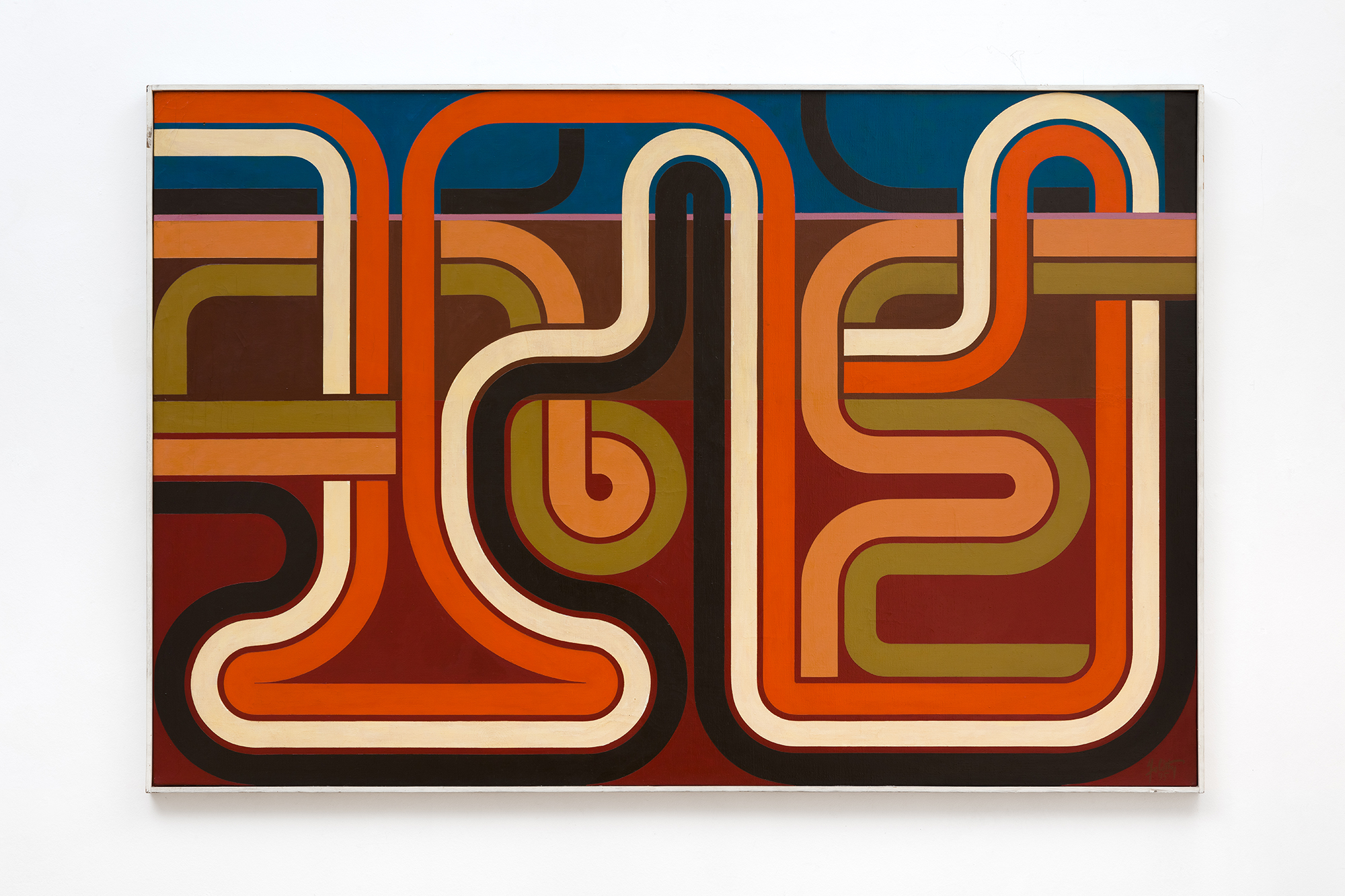A hetvenes években készült alkotásain lágyan hullámzó, vastag, íves vonalak egymást metszve vagy önmagukba visszatérő, a kereteken túlfutó formákként töltik ki a vásznai felületét. Színek sokaságával geometriai sziluettekké alakítja a technikai érdeklődésére számot tartó, ember alkotta tárgyakat. A létrejött kompozíciók egyfajta ellenőrzött spontaneitással bírnak; a precízen szerkesztett háttér biztos alapot nyújt a látszólag „szabadon futó” színcsíkoknak. Lírai színvilág és kontrasztos mély tónusok egyaránt jellemzik az ekkor készült munkákat. Az évtized végén a művész figyelme a kétdimenziós síkból a térhatású képszerkesztés felé fordult. Szögletes alakzatok váltották fel az ívelt formavilágot, melyek szétfeszíteni látszanak a vászon determinálta kereteket.