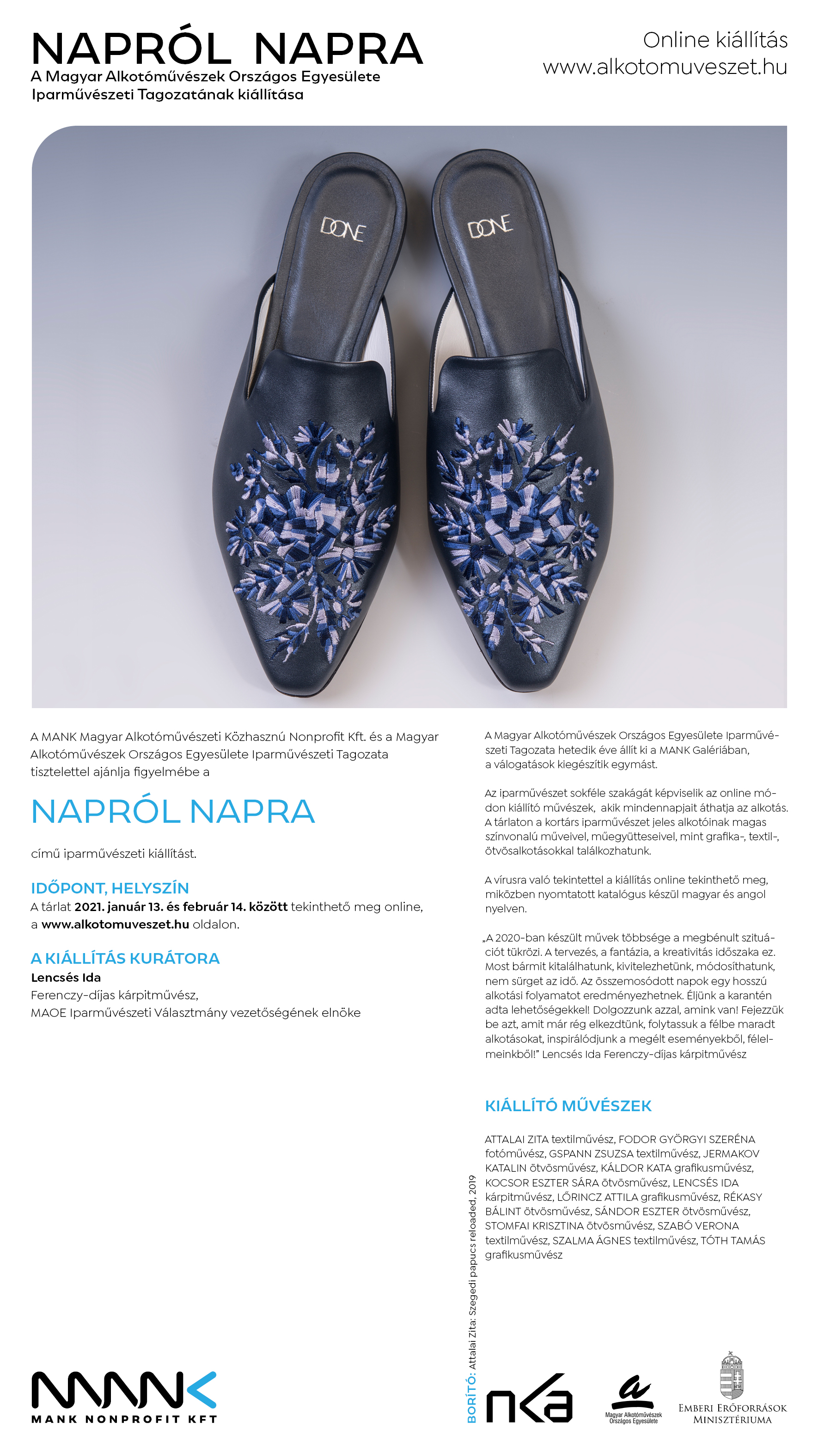 Az iparművészet sokféle szakágát képviselik az online módon kiállító művészek, akik mindennapjait áthatja az alkotás. A tárlaton a kortárs iparművészet jeles alkotóinak magas színvonalú műveivel, műegyütteseivel, mint grafika-, textil-, ötvösalkotásokkal találkozhatunk.