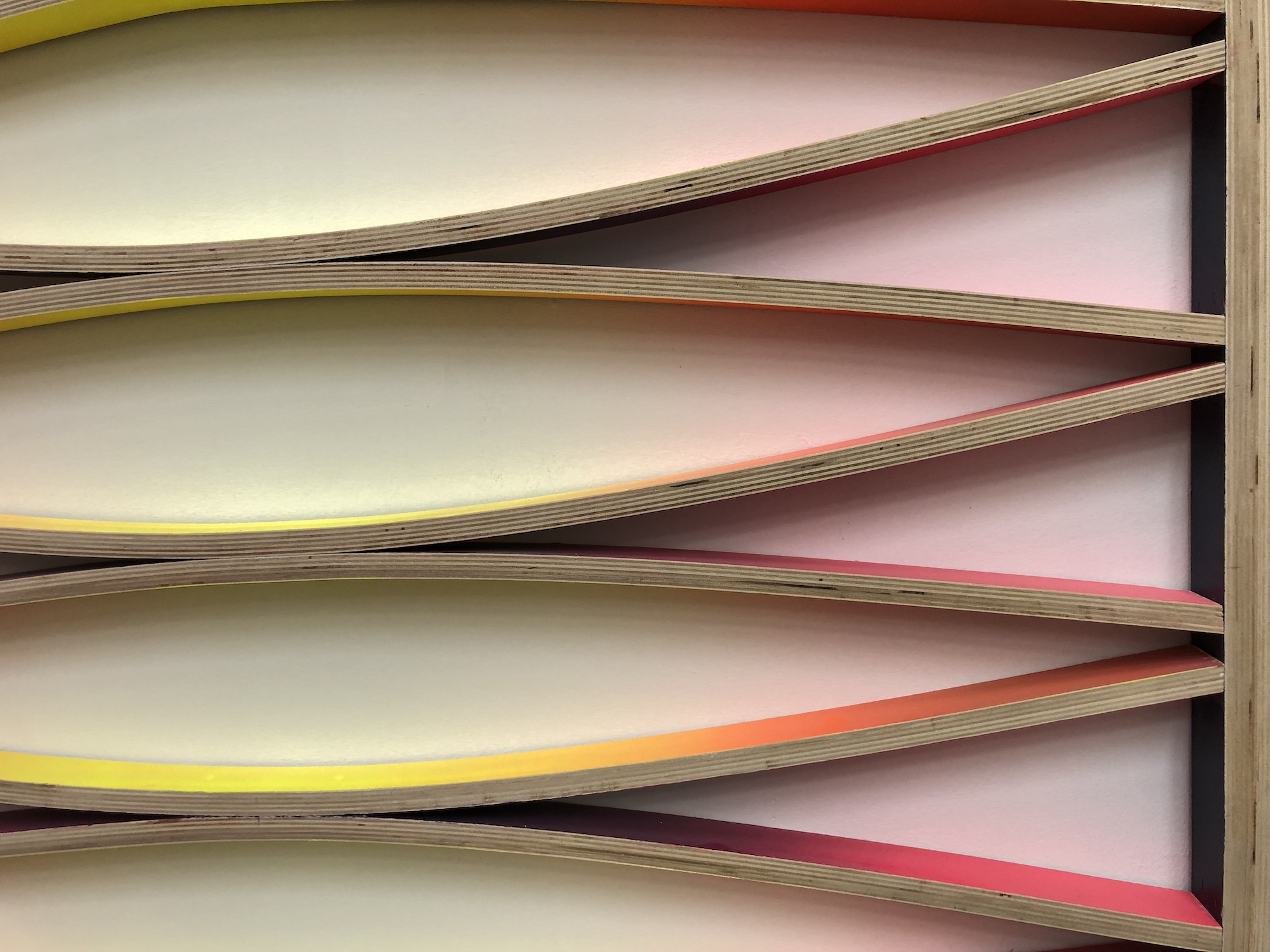 For almost 20 years, Anthony Vasquez worked within the genre of figurative painting as his primary medium to deal with his understanding of the human condition. Then 2020 happened, and with it came a sense of uncertainty and dysregulation. Vasquez was searching for some sense of control, struggling to find the narrative or figuration that could satisfy all that needed to be said. He drastically turned his ambition towards investigating multiple interpretations of lightness, asking the question, "How important is it to create uplifting work during times of unrest and struggle?" Through working with a new medium, play became the creative impetus towards engaging with the broader term of lightness. Exploring the subtle and soft glow of reflection and the hard, vibrant colors of light that are contrasted with the natural forms of wood, Vasquez created something entirely new. He developed a body of work that carries a sense of lightness, pulling from the past a tryptic of inspirations starting with the working class skills in construction and building he learned from his father and grandfathers, the awe-inspiring skylines of the Southwest region where he grew up in the United States, and the works of three specific contemporary artists. Richard Serra's connection of material to his father's trade, James Turrell and his open sky spaces, and the colorful curvilinear compositions of Frank Stella have become important elements that inform Vasquez's new work.