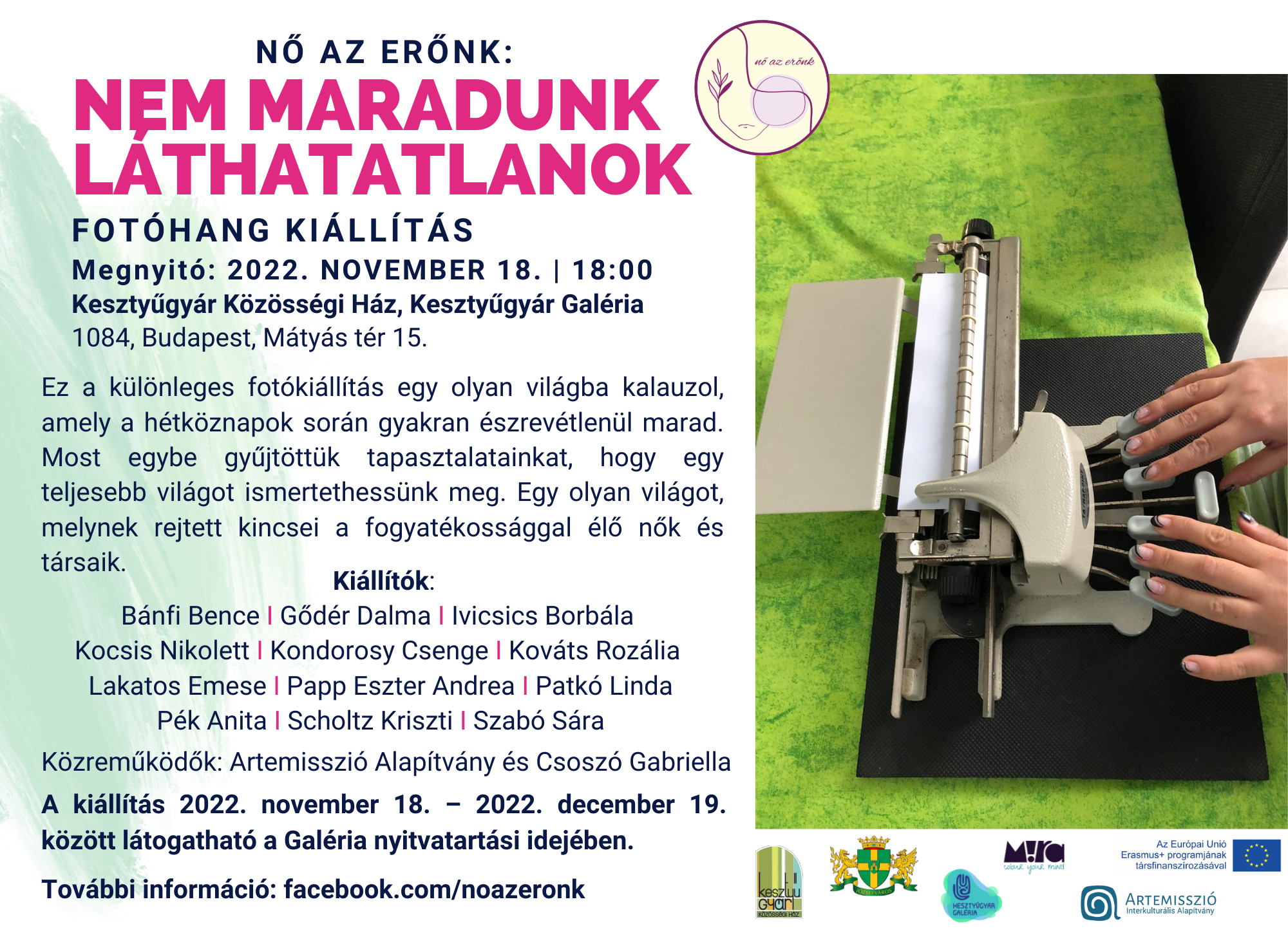 A Nő az erőnk csoport célja, hogy, események és művészeti projektek szervezésével segítse a fogyatékossággal élő nőket abban, hogy erősödjön a női identitásuk, kifejezzék és megmutassák magukat, és kapcsolódhassanak egymáshoz és másokhoz és ezáltal kitörjenek a láthatatlanságból.2022-ben a Nő az erőnk csoport az Artemisszió Alapítvány együttműködve 5 alkalomból álló fotóhang folyamatot szervezett Csoszó Gabriella segítségével. Ennek keretében egy - fogyatékosság és nőiség szempontjából - vegyes csoport közösen alkotott, és az alkotásokon keresztül jobban megismerték egymást, és egymás élethelyzetét is. Ennek eredményeképp született meg a Nő az erőnk- Nem maradunk láthatatlanok című kiállítás. A kiállítás anyaga a csoport tagjainak a folyamat során készitett képeiből és szövegeiből áll, amivel célunk megmutatni mindazt, amit a hétköznapi valóságban esetleg nem veszünk eléggé észre, elsiklunk felette.