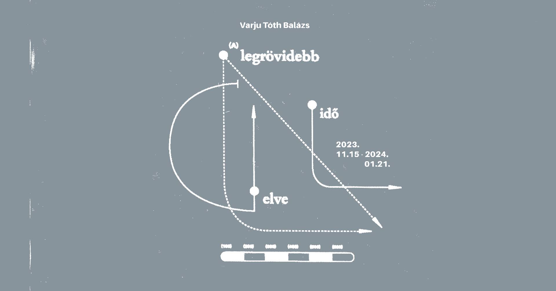 Varju Tóth Balázs az elmúlt években kezdett el kísérletezni a szövegírással. A részben autofikciós, részben kísérleti, filozofikus szöveg egy hanginstalláció formájában kerül bemutatásra, amelyben az otthonkeresés, el/kimozdulás, bezártság, változás(ra való igény), idegenség összefüggései tematizálódnak. A felvillanó mozgóképek különböző, a tájékozódást és a figyelmünk rögzítését segítő helyszínek, terek metaforáiként értelmezhetők, mint például a világítótorony jelzőfénye vagy egy szoba üressége. Fontos azonban, hogy ezek a rövid jelenetek nem a kiállítótéren végigvonuló hanganyag illusztrációi: a művészt éppen a szöveg és képek viszonya, az azon keresztüli elbizonytalanítás és feszültségteremtés érdekli. A címadó kifejezés a fizikában a fénysugarak két pont közötti legrövidebb idő alatt megtett útját jelenti: a kiállítás kísérlet egy immerzív videóinstalláció létrehozására, amely ugyanakkor nem a totalitásra törekszik, hanem a töredékességre, és az elbeszélés nehézségeire, töréspontjaira, zavaraira mutat rá.
