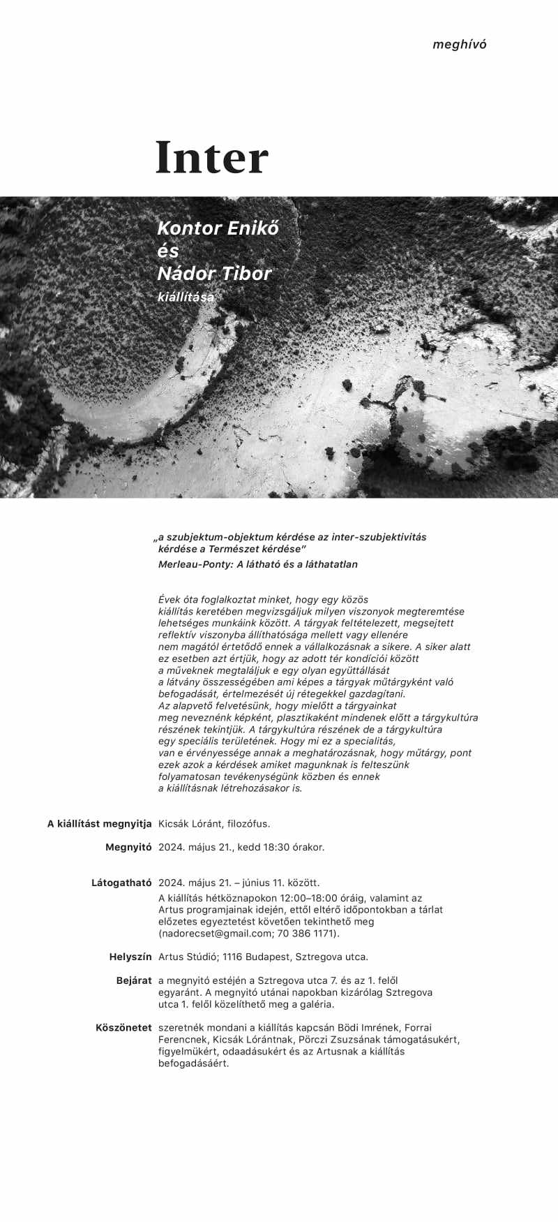 A kiállítás kapcsán köszönetet szeretnénk mondani Bödi Imrének, Forrai Ferencnek, Kicsák Lórántnak, Pörczi Zsuzsának figyelmükért, támogatásukért, odaadásukért és az Artus Stúdiónak a kiállítás befogadásáért.