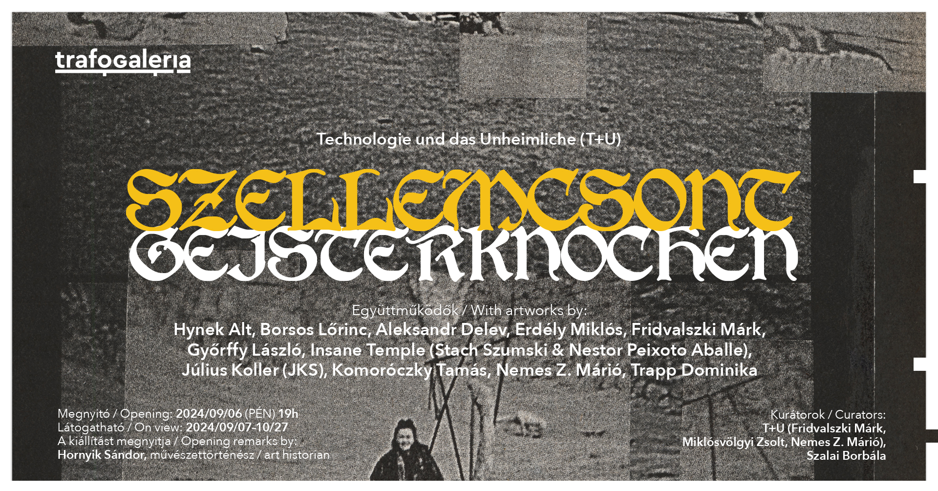 Technologie und das Unheimliche: (T+U) Szellemcsont | Hynek Alt, Borsos Lőrinc, Aleksandr Delev, Erdély Miklós, Fridvalszki Márk, Győrffy László, Insane Temple (Stach Szumski & Nestor Peixoto Aballe), Július Koller (JKS), Komoróczky Tamás, Nemes Z. Márió, Trapp Dominika