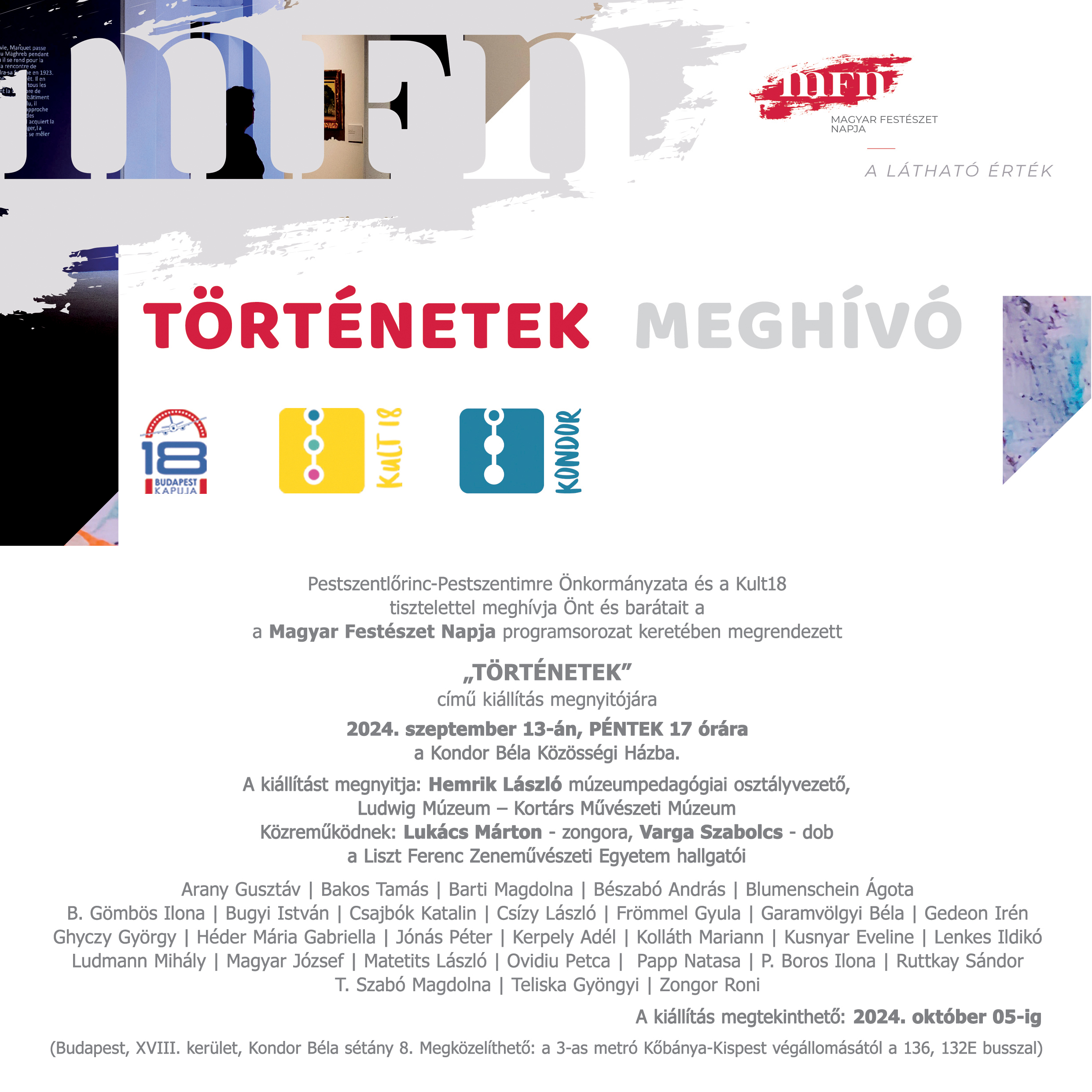Történetek (Magyar Festészet Napja) | Arany Gusztáv, Bakos Tamás, Barti Magdolna, Bészabó András, Blumenschein Ágota, B. Gömbös Ilona, Bugyi István, Csajbók Katalin, Csízy László, Frömmel Gyula, Garamvölgyi Béla, Gedeon Irén, Ghyczy György, Héder Mária Gabriella, Jónás Péter, Kerpely Adél, Kusnyar Eveline, Lenkes Ildikó, Ludmann Mihály, Magyar József, Matetits László, Ovidiu Petca, Papp Natasa, P. Boros Ilona, Ruttkay Sándor, Teliska Gyöngyi, T. Szabó Magdolna, Zongor Roni