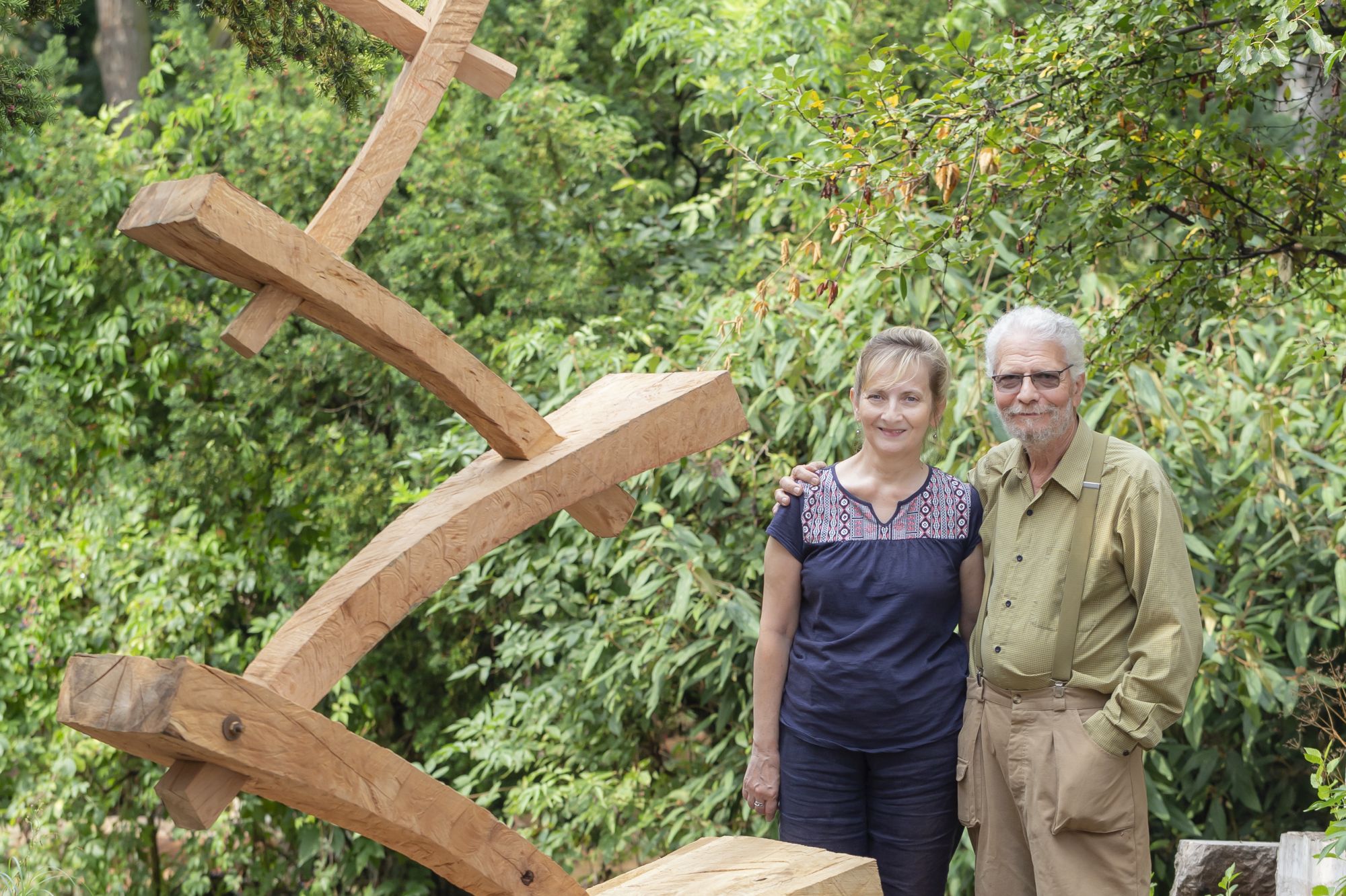 Farkas Ádám szobrászművész és Bodonyi Emőke művészettörténész a művész legújabb, a Kényes egyensúly című szobra mellett.