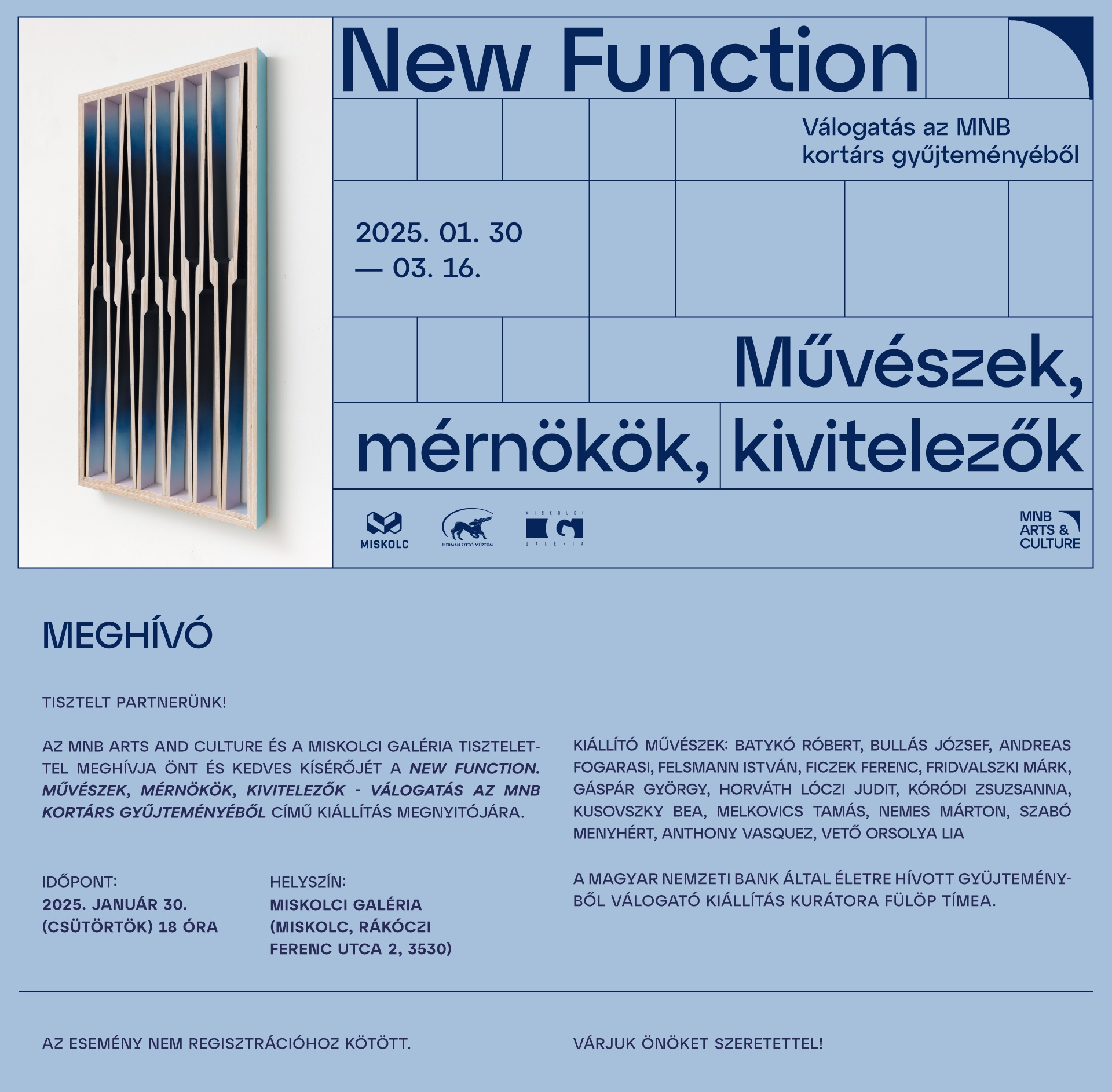 Az MNB Arts and Culture és a Miskolci Galéria együttműködésének nyomán egy olyan cso-portos kiállítás nyílik 2025. január 30-án, amely a Magyar Nemzeti Bank kortárs gyűjteményé-ből válogat. Fülöp Tímea kurátori koncepciójának fókuszában olyan művészek állnak, akik praxisukban szoros kapcsolatot ápolnak a technológiai és ipari fejlődéssel. A kiállított tárgyak arra a folyamatra reflektálnak, melynek során az új és régi ipari eljárások, eszközök, illetve anyagok beépülnek a művészetbe, kiegészítve a klasszikus hagyományokat. A váratlan funk-ciók felfedezése ugyanannyira bizonyítja a mérnöki gondolkodás sokoldalúságát, mint a mű-vészi kreativitást