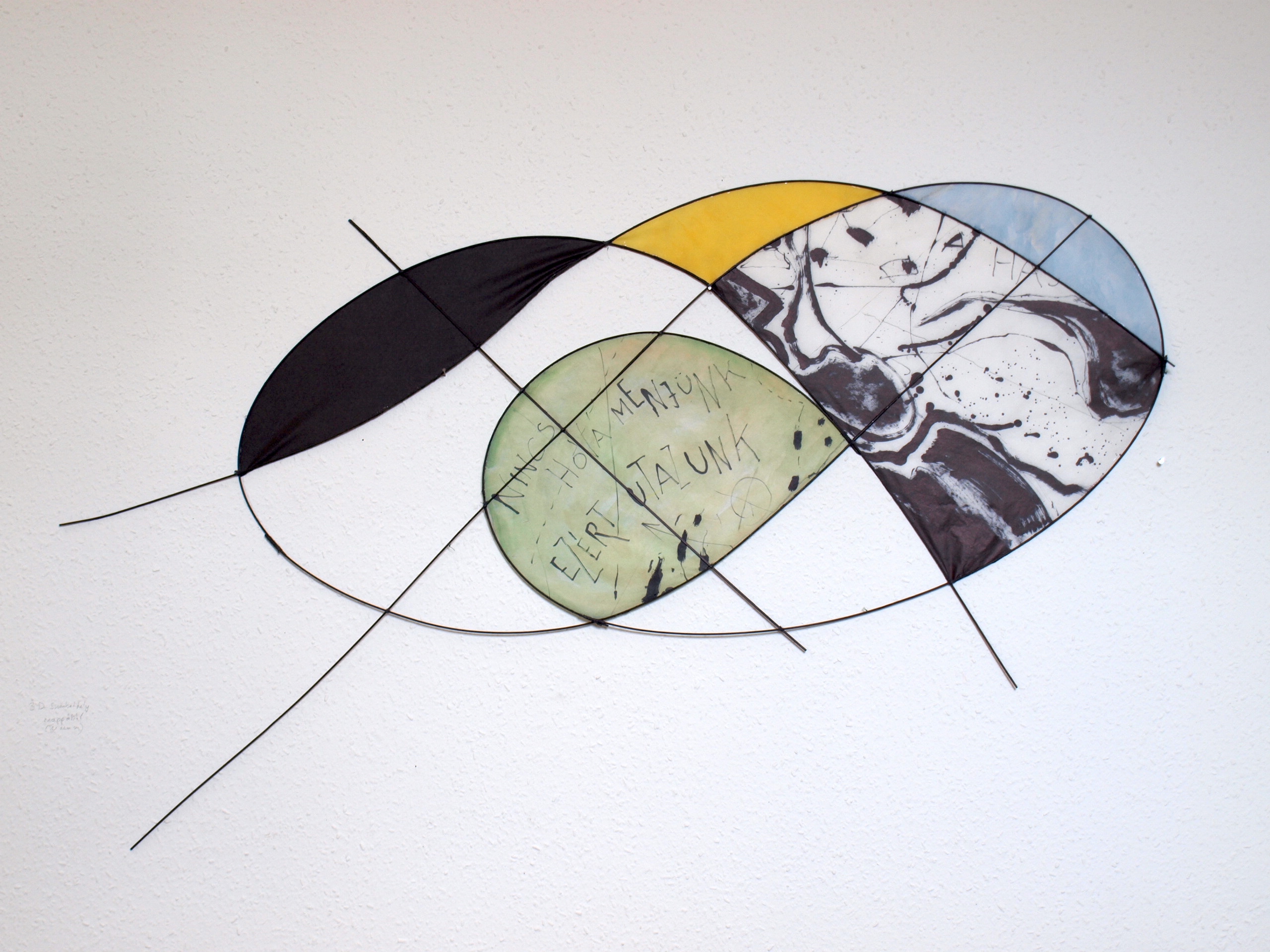 „Nincs hova menjünk, ezért utazunk” – írta, rajzolta BODÓCZKY István (1943-2020) az ívelt bambuszszálakkal strukturált, felhőként a galériatérben lebegő Firkák 5 című, 1996-ban készült munkájára. Az alkotás metaforikusan foglalja össze a kilencvenes évek magyar kulturális nyitásának paradoxonát: a szabadság végtelen lehetőségét és annak szorongásra is okot adó, nyomasztó terhét, miközben az „út”, az úton levés jelentőségére is rámutat. A festmény szép rajzolatú, ívelt vonalakkal határolt képtestén semmi sem állítja meg az ívekkel határolt forma dinamikus szabadságát, a konstruált belső szerkezet szekventált területelemei egymásba kapcsolódnak. BODÓCZKY munkáin a rajzolt vonal és a folt egymásba folyik, az írott szöveg rajzzá alakul. A festő számára a vonal és a folt egyenértékű képi elemek, miközben a színek használata – vagy épp mellőzése – szintén tudatos döntés eredménye.