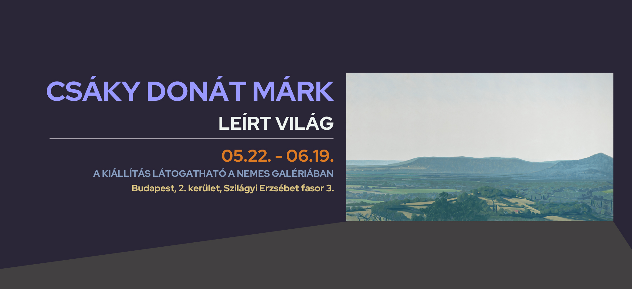 Csáky Donát Márk Leírt világ című önálló kiállítása a művész legújabb alkotásait mutatja be, melyeken a tőle megszokott helyszínek – Várvölgy és Verőce – tájtapasztalatait rögzíti.