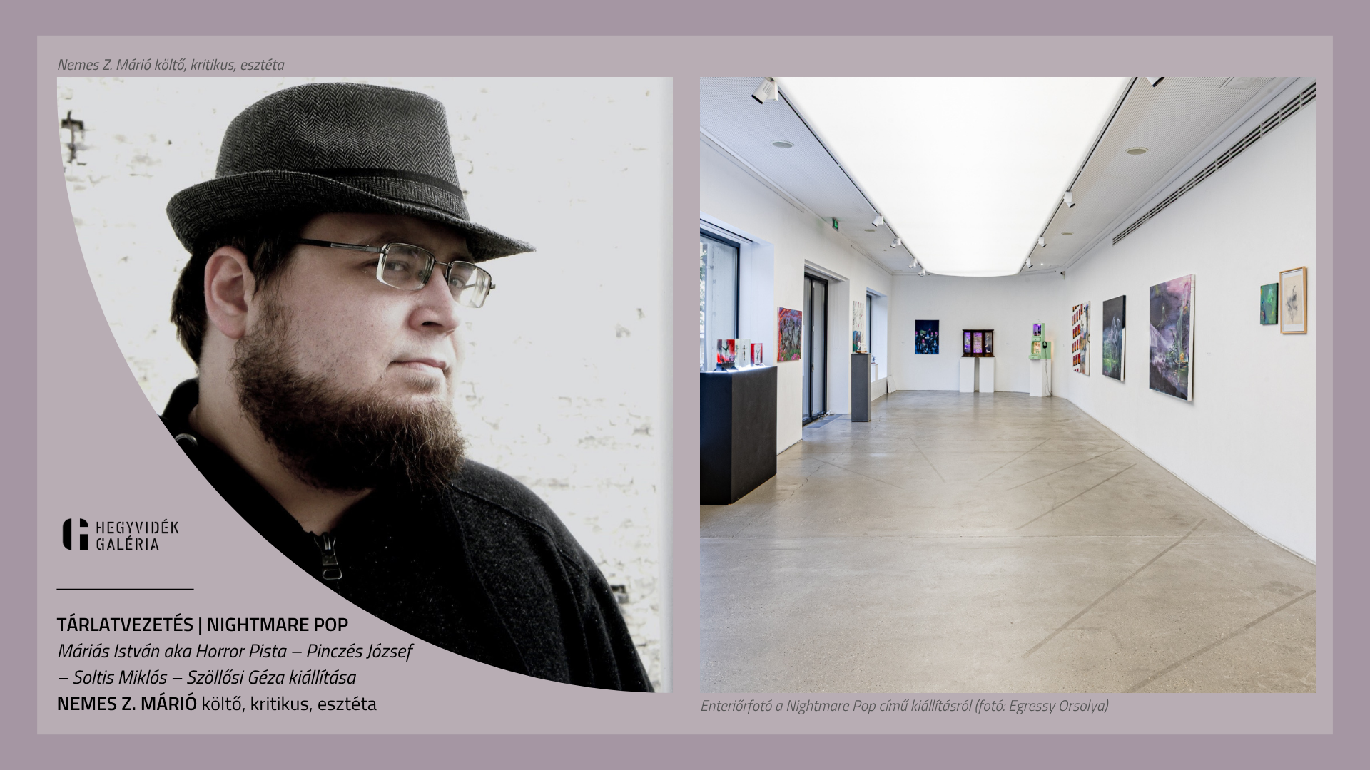 Máriás István aka Horror Pista – Pinczés József – Soltis Miklós – Szöllősi Géza képzőművészek „Nightmare Pop” című kiállításán Nemes Z. Márió költő, kritikus, esztéta tart tárlatvezetést, amely során a négy alkotó különös látomásai, többféle médiumai kerülnek kontextusba. Szó lesz többek között a tudattalan és a kísérteties (heimlich-unheimlich) kapcsolatáról, érintve a különféle magánmitológiákat, az idegenség és másság poszthumán értelmezését, a popkultúra és bioszféra horrorisztikusba hajló metszéspontjait, valamint az alkotók giccs- és barkácsesztétikai stratégiáit.