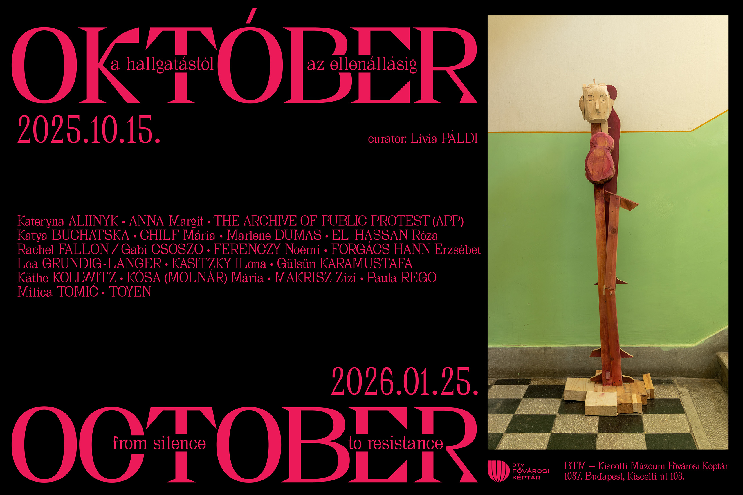Az OKTÓBER a felelősség és az egyéni cselekvőképesség lehetőségeit keresve, a művészet aktivizáló erejét és a személyes terekben formálódó szolidaritás lehetőségeit járja körül. A kiállításon bemutatott válogatás a magánszféra politizálódását vizsgálja – elsősorban azt, miként teszik láthatóvá a kataklizmák idején szerzett személyes tapasztalatok és megfigyelések az erőszak hatásait, illetve a feldolgozatlan kollektív traumák továbbélését. Az OKTÓBER közvetlen előzménye a Budapest Galériában két éve rendezett Az erőszakról című, feminista és queer nézőpontokat is érvényesítő tárlat, amely árnyaltan elemezte a rendszerszintű erőszakot és a patriarchális rend politikai-gazdasági-kulturális beágyazottságát.