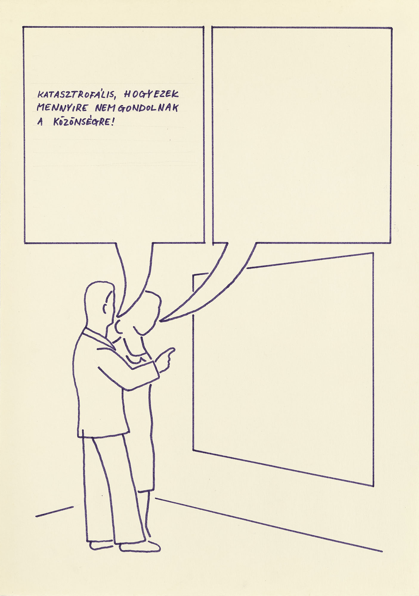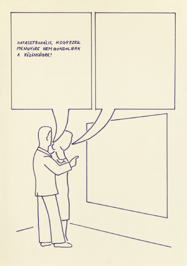 A Katasztrófa-helyzetek Birkás Ákos korábban szinte ismeretlen, utoljára mintegy fél évszázada látható képregényformátumú műveit mutatja be. A címadó sorozat 1978-ban, a Kép és néző konceptuális fotómunkákkal párhuzamosan készült, amely lezárta Birkás három évig tartó, elsősorban a múzeum és a művészet, a festészet és a fotográfia, a néző és a műalkotás, illetve a szöveg és a kép elméleti és gyakorlati viszonyait a Szépművészeti Múzeumon keresztül vizsgáló, grandiózus projektjét. Amíg a Kép és néző sorozat félig ironikusan, félig komolyan a műbe való bevonódás legközvetlenebb formája, legfelsőbb foka felé irányult, az annak ellenpárjaként is értelmezhető Katasztrófa-helyzetekben a nézők az immerzió nullfokához közelítenek. Ahogy a Kép és néző sorozatban a kép előtt friedrichi Rückenfigurként háttal álló nézőt nézzük, Birkás a Katasztrófa-helyzetekben is mintegy megduplázza az ábrázolt szituációt: a legkülönfélébb variációkat és interpretációkat alkotja meg arra az egyetlen, filctollal stilizáltan megrajzolt alaphelyzetre, ahogy egy férfi és egy nő értelmezni próbál egy a rajzon csak kontúrvonalaiban jelzett táblaképet. Ugyanakkor mintha mindegyik banális, értetlenkedő vagy épp túlszofisztikált reakció azt sugallná, hogy ahogy e képregény-művek nézői, azok szereplői is nézik, de voltaképpen nem látják a képen ábrázolt képet, a művel és egymással folytatott párbeszéd helyett egy projekciós vagy tükröződő felülettel monologizálva. A nézők mondatai a képregényekben bevett, lekerekített szövegbuborékok helyett a táblaképpel megegyező méretű „szövegtéglákban” olvashatók, azaz a rajzok eleve azt közvetítik, ahogy a textuális panelek képesek egyenértékűvé válni a vizuális panelekkel: a műalkotás olvasandó, megértendő szöveggé válik, míg a szöveg a mű felületére ráíródó textuális réteggé.