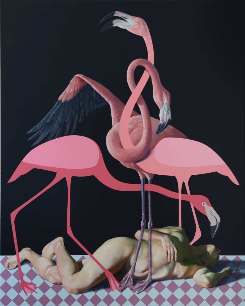 Dinoszauruszok, rózsaszín flamingók, meztelen emberi testek, pepitamintás felületek, lángoló világ, szamóca és vörös függöny, csakhogy néhány motívumot említsünk Orr Máté részletekben és szimbólumokban gazdag, nagy várakozással övezett, legújabb sorozatából.