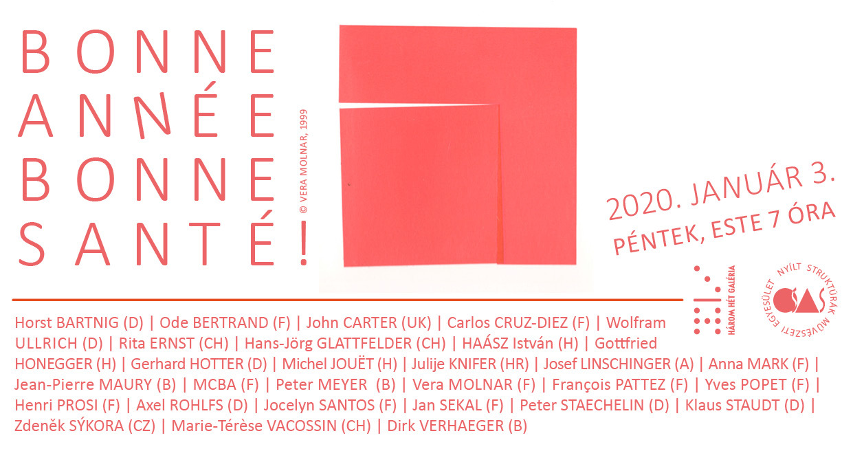 Művészkörökben régi kedves szokás, hogy az év végén az alkotók saját kisebb munkájukkal ajándékozzák meg egymást és barátaikat az új esztendő alkalmából. Ezek általában kisebb postai borítékban elférő kis formátumú művek, melyeknek gyakran csak évtizedek múlva észlelhető bármiféle piaca, ha egyáltalán … Nem is nagyon gyűjtik, pedig sokszor jelentős művek első vázlatait is sejtetik az apró kis munkák. A mostani mini-tárlat a budapesti Szöllősi-Nagy – Nemes Gyűjteményből mutat be a geometrikus/konkrét művészet területéről egy szűkebb nemzetközi válogatást a Párizsban élő és aktívan dolgozó Vera Molnar 96. születésnapjának tiszteletére.