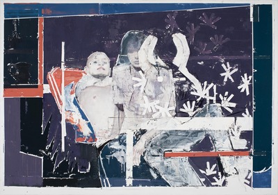 A papírmunkák sterilitását a vásznak roncsolt felületei törik meg, amelyek Tinei művészetében mindig is kulcsfontosságú szereppel bírtak mind tartalmi, mind esztétikai értelemben, és amelyek, ha lehet, még hangsúlyosabbá és drasztikusabbá váltak legújabb festményein. A kompozíciós elemként is használt kitakarások és maszkoló szalaggal létrehozott fehér csíkok ritmikus szövevénye ugyanezt a töredezettséget szimbolizálják – az így létrejövő absztrakt rétegek szinte bekebelezik Tinei jól ismert alakjait, és magukat is sokszor elnagyolt formákká alakítja, felszólítva nézőit arra, hogy képzelőerejükkel az alkotói folyamat részeseivé váljanak.
