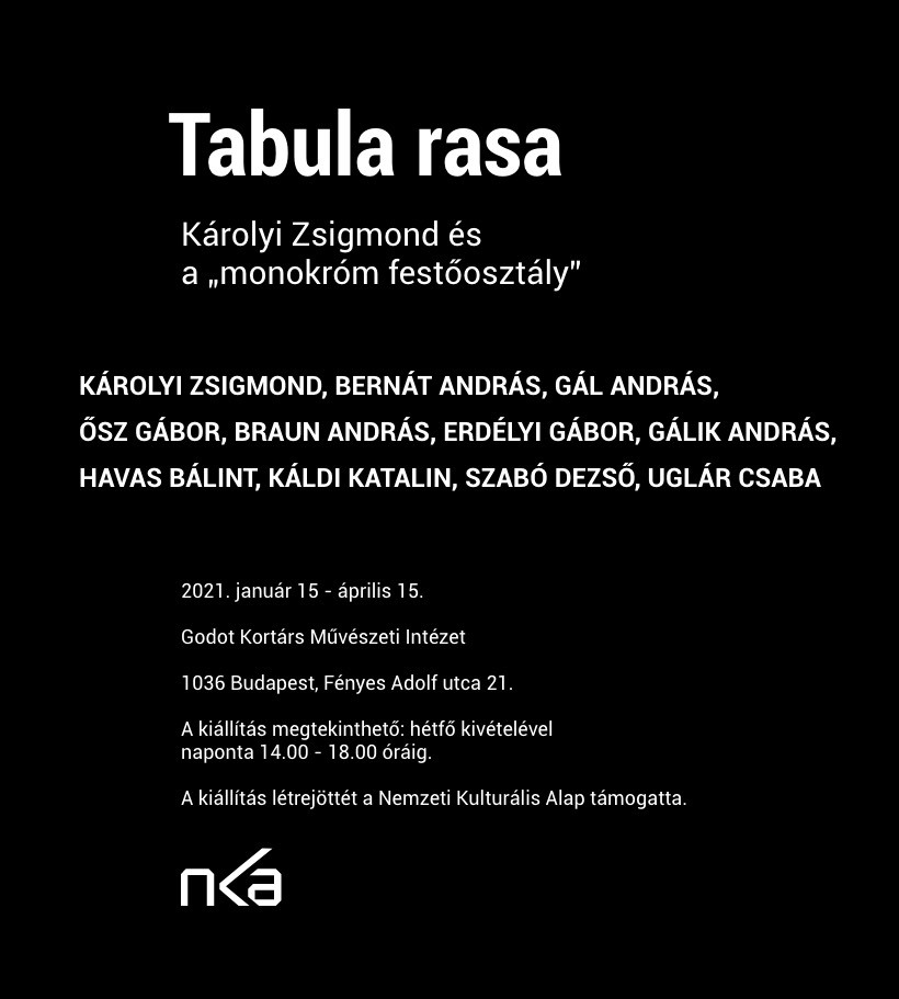 A Tabula Rasa című kiállítás a "monokróm festőosztály" történetét mutatja be, az osztály tanárainak - Károlyi Zsigmond, Bernát András, Gál András - és a kurzusokat látogató hallgatók - Braun András, Erdélyi Gábor, Gálik András, Havas Bálint, Kis Varsó, Káldi Kata, Szabó Dezső, Uglár Csaba - válogatott alkotásain keresztül.