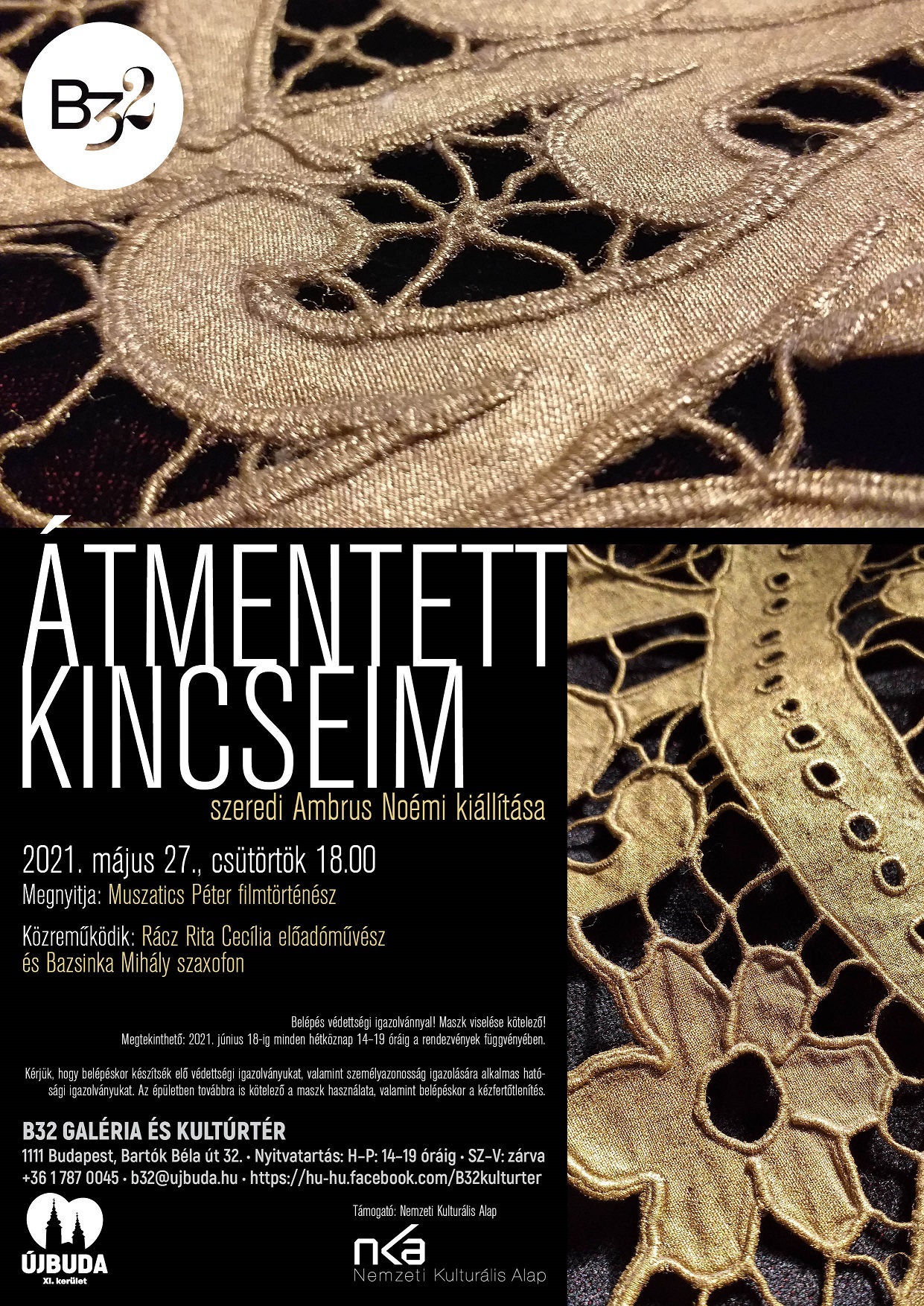 A B32 Galéria és Kultúrtér a koronavírus ellen védett személyek és a felügyeletük alatt lévő kiskorúak számára látogatható, ezért kérjük, hogy belépéskor készítsék elő védettségi igazolványukat, valamint személyazonosság igazolására alkalmas hatósági igazolványukat.