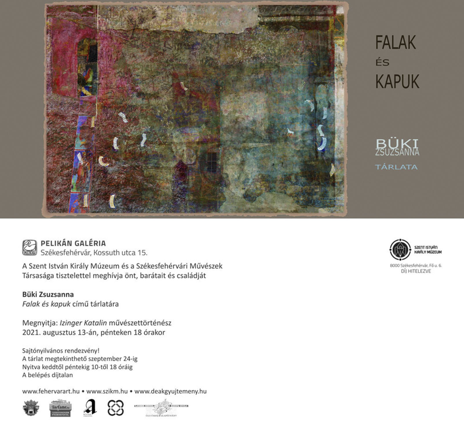 A Szent István Király Múzeum és a Székesfehérvári Művészek Társasága tisztelettel meghívja önt, barátait és családját Büki Zsuzsanna Falak és kapuk című elektrográfiai tárlatára a Pelikán Galériába (Székesfehérvár, Kossuth L. u. 15.).