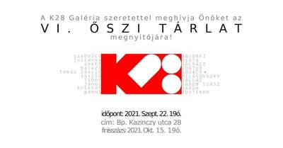A K28 Galéria szeretettel meghívja Önöket az VI. Őszi Tárlat megnyitójára. A tárlaton a galéria alkotóinak új munkáit mutatjuk be. Kiállítók: Bátorfi Szabolcs Berta Julianna Gályász Anett Kontur Balázs Milasovszky László Sallai Tibor Saxon Szász János Varga Kristóf