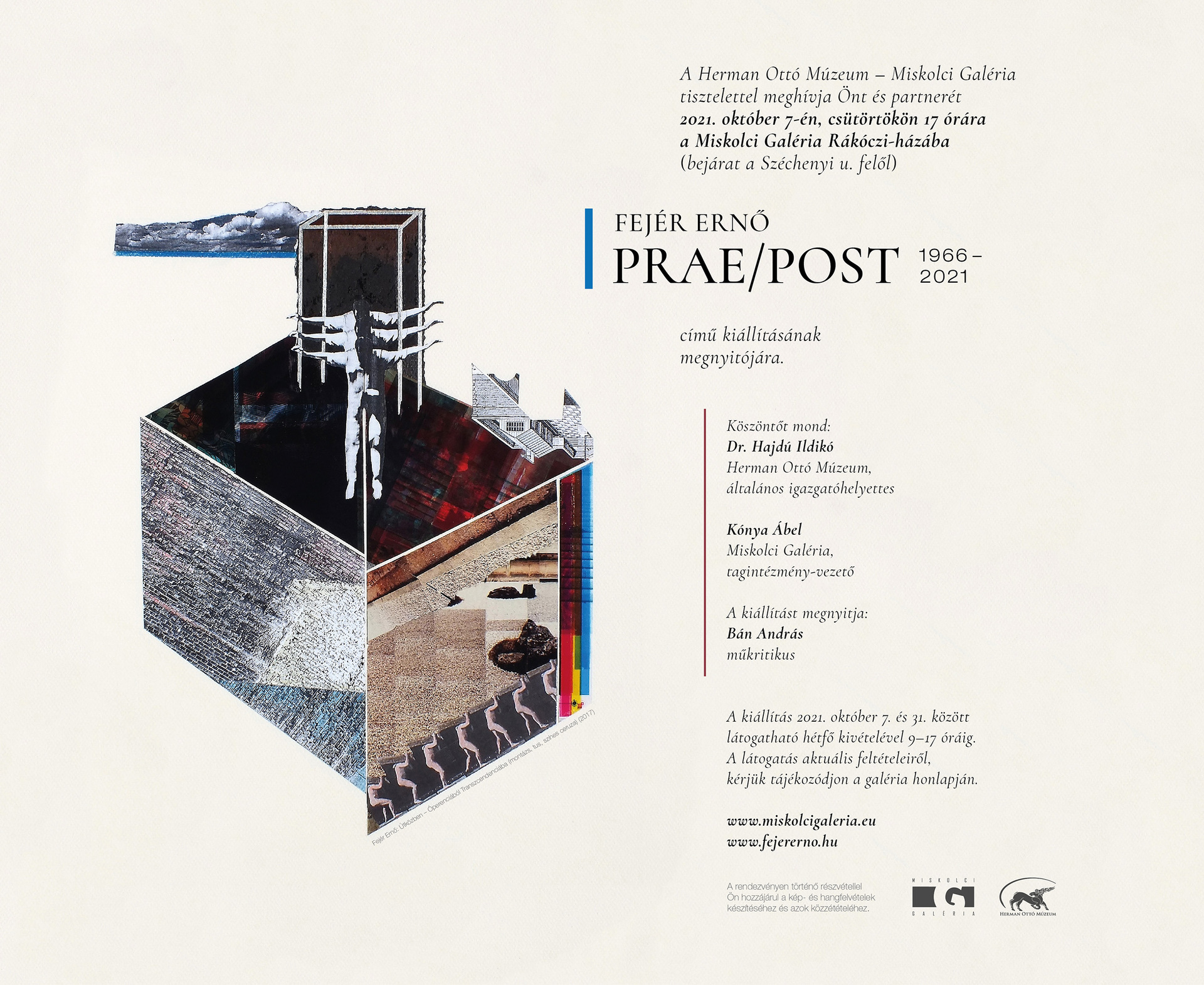 "A kiállítás abból a kizárólagos alkalomból jött létre, hogy teljes és a műkereskedelem által érintetlen képzőművészeti anyagomat Miskolc Városának adományozom. A kiállítás nem retrospektív, bár annak akar megfelelni. Nagy időtávot fog fel az ösztönös, autodidakta kezdetektől 1966-tól a 2021-ig. A rajzaimnak inkább az elejéről míg a montázsaimnak inkább a publikálatlan végéről válogattam az anyagot."