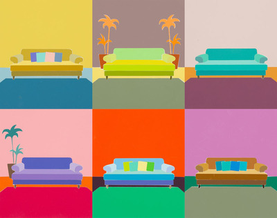 A bezártság idején a műterem helyett az otthoni környezet lép elő az alkotás, a munkák létrehozásának helyévé, s emiatt kénytelen új, eddig a műveiben nem alkalmazott anyagokhoz nyúlni: nevezetesen a színes papírhoz és ceruzákhoz. A képeslap méretű munkákat a konyhaasztalnál is el lehet készíteni, a folyamat pedig, a festéssel ellentétben száraz, tiszta, az eszközök könnyen elpakolhatók. Mivel hagyományosan a papíralapú művek a művészeti hierarchiában a festészet alatt helyezkednek el, a kényszerűségen túlmutató jelentést láthatunk a tudatos anyagválasztásban. Schwéger a repetitív színválasztás, kivágás, ragasztás, illetve színezés folyamatának értéket tulajdonít. A művekben a kompozíció következetes: ugyanaz a dívány, fotel és ágy jelenik meg, a művész ezek színeivel és geometrikus formáival játszik. A téma és az anyag limitáltsága ellenére az ismétlés folyamata felszabadító. A végtelenségig ismételhető kompozíciók nem az unalmasságot hangsúlyozzák, hanem újabb és újabb felfedezéshez vezetnek.