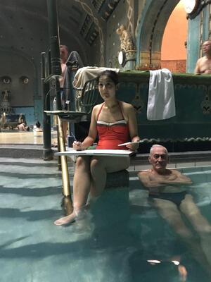 Christelle Téa munkamódszerére jellemző, hogy előzetes vázlatok, minden különösebb rákészülés nélkül, a helyszínen, minden apró részletet megfigyelve készíti el összetett munkáit. A fürdő munkatársai emlékeznek is a fiatal művésznőre, aki fürdőruhában, a medencék szélén ülve, vagy egy sarokban meghúzódva nyitástól zárásig rajzolt.