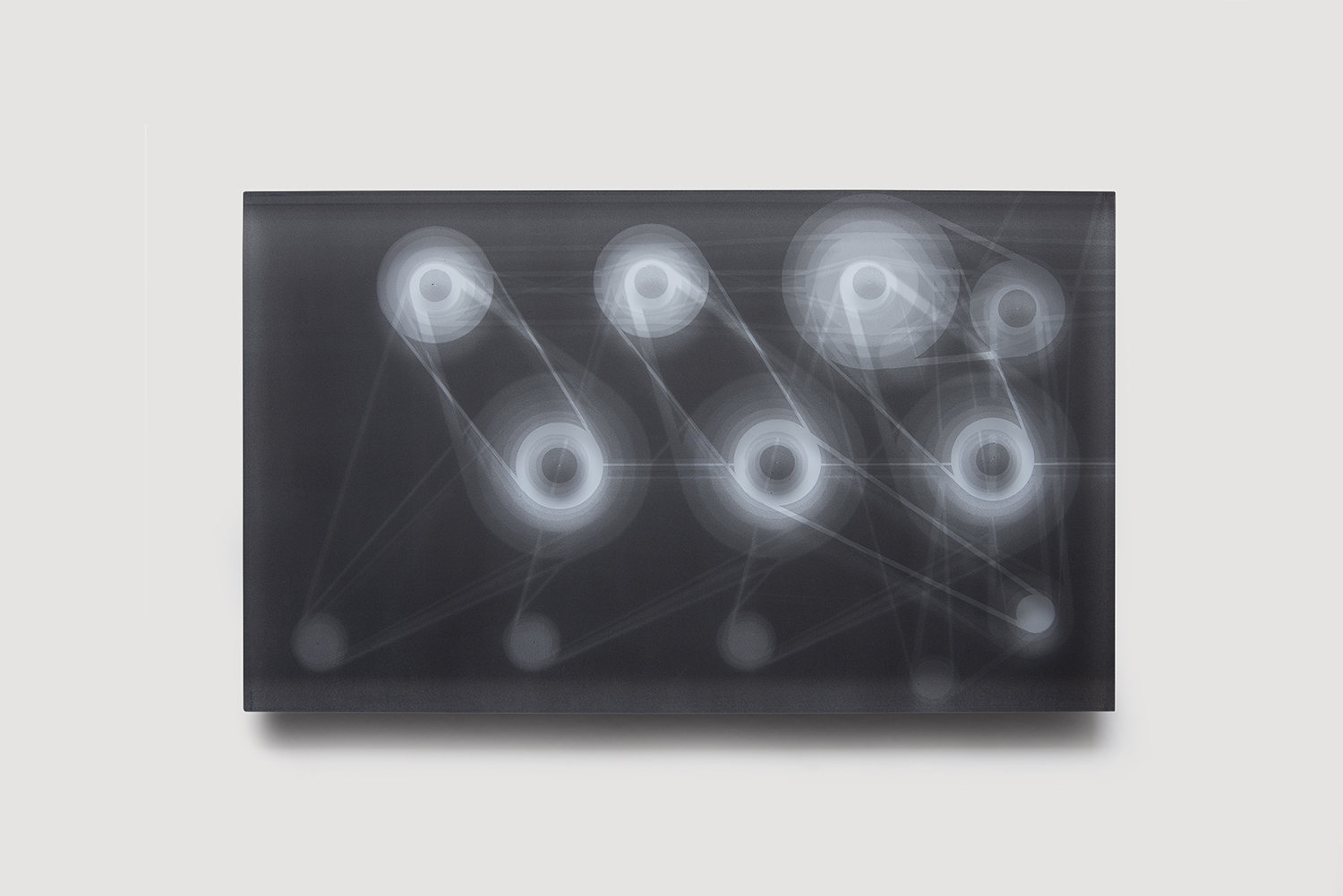 Image: Gép I., 2022, ragasztott, kézzel csiszolt, polírozott optikai üveg, UV festék, 36x60x5 cm