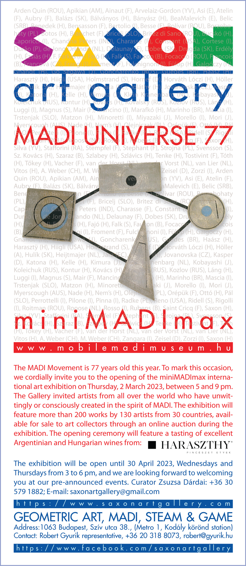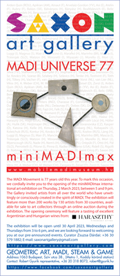 A MADI Univerzum 77 eseménysorozat részeként a SAXON Art Galéria felhívással fordult a világ bármely táján élő, MADI érintettségű vagy tudatosan a MADI szellemiségében alkotó művészekhez, hogy vegyenek részt alkotásukkal a galériában szerveződő miniMADImax című nemzetközi kiállításon