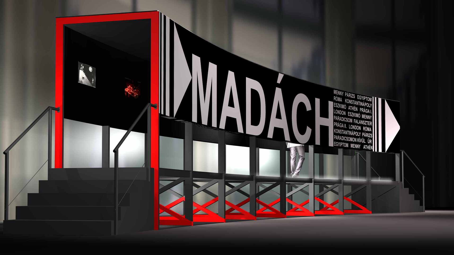 A Prágai Quadriennálé (PQ) a színházi látványtervezés és színházépítészet nemzetközi seregszemléje, egyben a világ egyik legrangosabb képzőművészeti eseménye, mely ötvenhat éves múltra tekint vissza. Az Országos Színháztörténeti Múzeum és Intézet kiállítása 1971-2023 közötti PQ anyagaiból ad válogatást. Madách Imre születésének 200. évfordulója kapcsán az Országos Színháztörténeti Múzeum és Intézet – saját gyűjteményeinek felvételeiből, dokumentumaiból és fényképeiből – tizenöt monitoron kínál összeállítást. A két kiállításnak Mira János Jászai-díjas díszlettervező látványtervei adnak színházi keretet. Az installáció korábban a Nemzeti Színház előcsarnokában és a debreceni Csokonai Nemzeti Színházban volt látható.