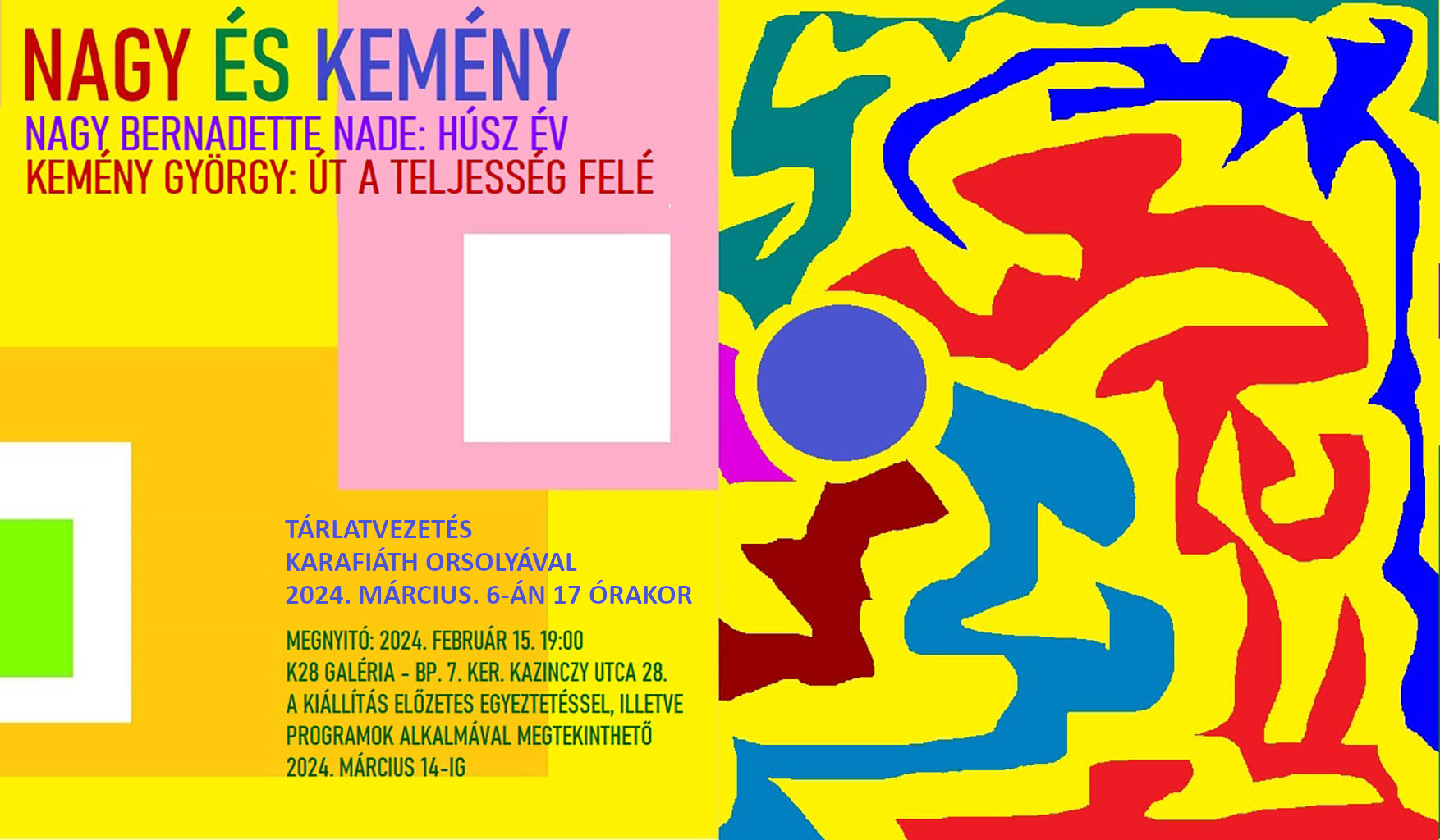 "Két régi motorosok vagyunk, jómagam Főiskola óta, azaz 63 éve vagyok képzőművész és voltam sokáig plakátgrafikus, Nade könyvkereskedés, Írók Boltja után, 20 évvel ezelőtt kezdte el művészi pályáját. Számos csoportos és egyéni kiállításunk volt már, helyszűke miatt nem sorolom, de közös kétfős tárlatunk most van először, ami igen nagy öröm számunkra, hisz együttélésünknek idén fogjuk ünnepelni 25-ik évfordulóját. Ezzel együtt munkáinkban egyáltalán nem utánozzuk egymást, két különböző entitás vagyunk, ami pompás, aki ismeri már, vagy most ismeri meg képeinket, azok számára ez egy perc alatt egyértelmű. Mégis néhány szóban: Nade képei szuperérzékenyek és erőteljesek is egyszerre, a csendtől a kiáltásig, a fehértől a mélyfeketéig minden szerepel munkáiban, változatos és ötletes anyagokat használ, mint például a mosásnál használatos kommersz színfogókat, de mindent kompozícióvá, művé emel. Még az is megjegyzendő, hogy míg Nade képeinek zöme a geometrikus absztrakt stílusba sorolható, ez a mű kivétel, inkább egy lágyan mozgó folyam jut róla eszünkbe. Nálam sem a szuperérzékenység, sem a csend nem jellemző, plakátos évtizedeimben és párhuzamos, máig készülő képeimben, plasztikáimban a tubus színek, az erős hangvétel a jellemző. Plakátjaim egykor odavonzották még messziről is a tekintetet, és 1968-ban, az Amerikában is épp csúcsra járt Pop Art idején a Fészek Klubban harsány Pop Art stílusú kiállításom okán jeles fiatal művészettörténészek, galériások a stílus egyik akkori vezető művészének tartanak, mára már az egykori tárlat több darabja jelentős hazai és külföldi múzeumok tulajdona. Nagyot ugorva: ezen a közös K28 Galériában rendezett kiállításunkon Nade húsz évnyi munkáiból és a legújabbakból válogatta anyagát, én pedig 2023. november 6. és december 22. között készült „Út a teljesség felé”, egyik legkedvesebb költőmtől, Weöres Sándortól elcsent című 32 darabos képsoromból emeltem a galéria falaira hetet, köztük egyet az általam kedvelt igen nagy méretben. Számunkra is izgalmas meglepetés, hogy milyenek képeink itt és most és együtt. Ennek megítélésére nagy szeretettel várunk mindenkit a megnyitóra, a kiállításra, a kísérő eseményekre."