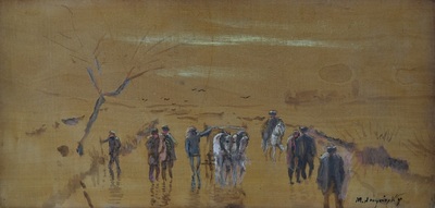 Kép // Mednyánszky László (1852–1919: Katonák a vízben, 1916–1918; olaj, fa, 15,5x32 cm; Antal–Lusztig-gyűjtemény