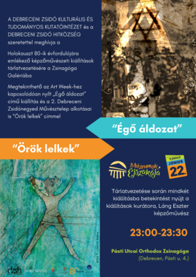 A „Zsinagóga Galériában” megtekinthető az Art Week-hez kapcsolódóan nyílt „Égő áldozat” című kiállítás, és a képzőművészet iránt érdeklődők számára láthatóak lesznek a 2. Debreceni Zsidónegyed Művésztelep alkotásai is "Örök lelkek" címmel. Tárlatvezetése során mindkét kiállításba betekintést nyújt a kiállítások kurátora, Láng Eszter képzőművész.
