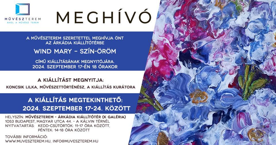 2024. szeptember 17-én 18 órakor WIND Mary - SZÍN-ÖRÖM című kiállításának megnyitójára.