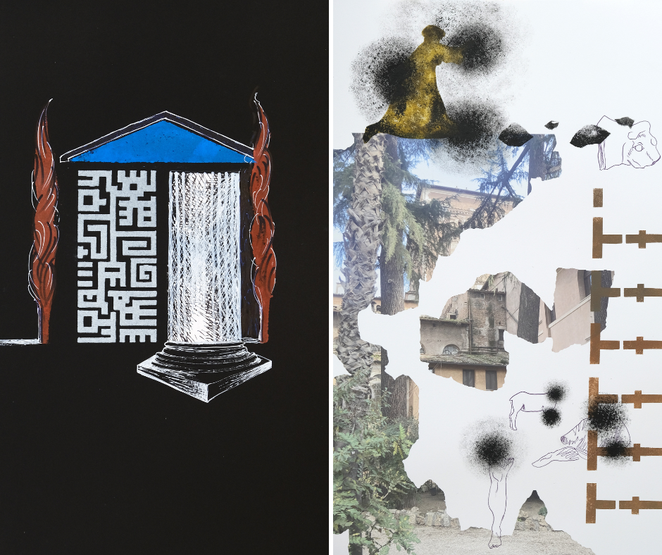 Sóváradi Valéria és Fabricius Anna a Római Magyar Akadémia ösztöndíja által hónapokat töltött Rómában. Ugyan a két anyag létrejötte közt eltelt 25 év, a forrás geográfiai, kulturális öröksége nem változott, a két szemlélet viszont nagyon is különböző. Róma egy megkerülhetetlen referenciapont. Sóváradi munkásságában már visszatekintve látjuk, tapasztalatai hogyan hatottak rá hosszútávon. Egy új kezdetként definiálja saját művészetében az ott megélteket, amelyek formai változatosságukkal és arányrendszerükkel mind a mai napig hatnak festészetére. Fabricius munkái leginkább a töredékesség oldalára – mint pillanatnyi kapott látványra –, illetve a nemlátható fontosságára kérdeznek rá. Érdekes, hogy a kitakarás és a nemláthatóság mindkét művészi ábrázolás szignifikáns része, de míg Fabricius képei fragmentáltságukból adódóan nem mutatnak rá pontosan a hiány helyére, addig Sóváradi alkotásain a kitakarás, az adott látvány részleges hiánya pontosan megmutatja az akkori Róma szemmel látható állapotát.