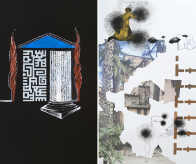 Képek: SÓVÁRADI Valéria – Szegmentum I., 1992–2002. Litográfia, vegyes technika, 53 x 40 cm; FABRICIUS Anna – Vakfolt 4., 2024. Fotó etching papírra nyomva, indigó, akril, egyedi darab, 70 x 50 cm.