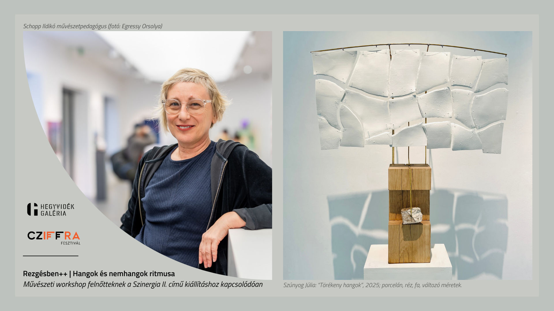 A Cziffra Fesztivál keretében megrendezett „Szinergia II.” című kiállításhoz kapcsolódó, felnőtteknek szóló művészeti workshop során a hang és a csend viszonyát vizsgáljuk: azt a finom egyensúlyt, amelyben a megszólalás és az elnémulás, a jelenlét és a hiány egymást formálja. Figyelmünket a belső és külső hangokra irányítjuk – arra, hogy adunk hangot, hogy fogadunk be rezdüléseket, miként szerveződik ritmussá mindaz, ami körülvesz bennünket.